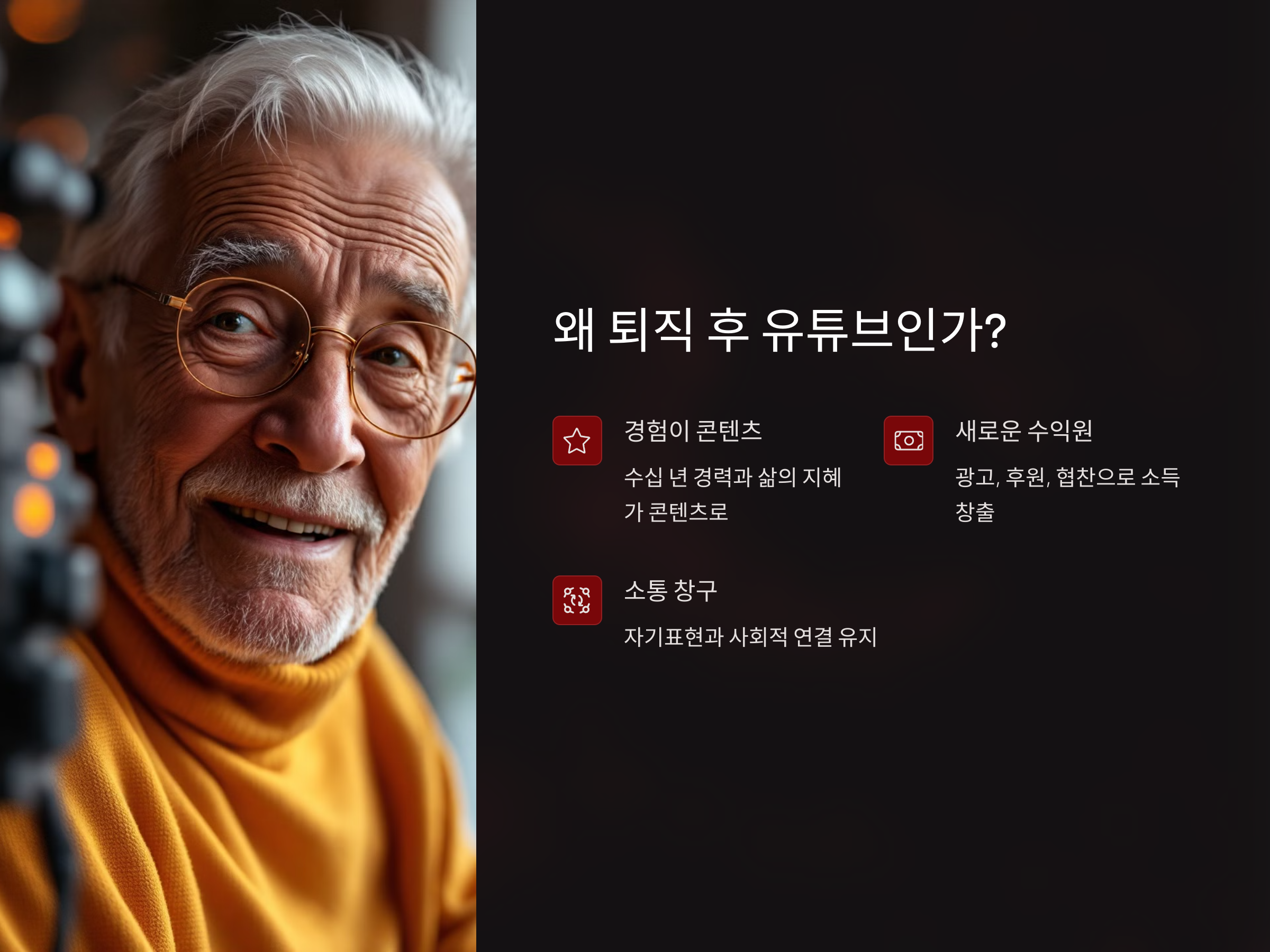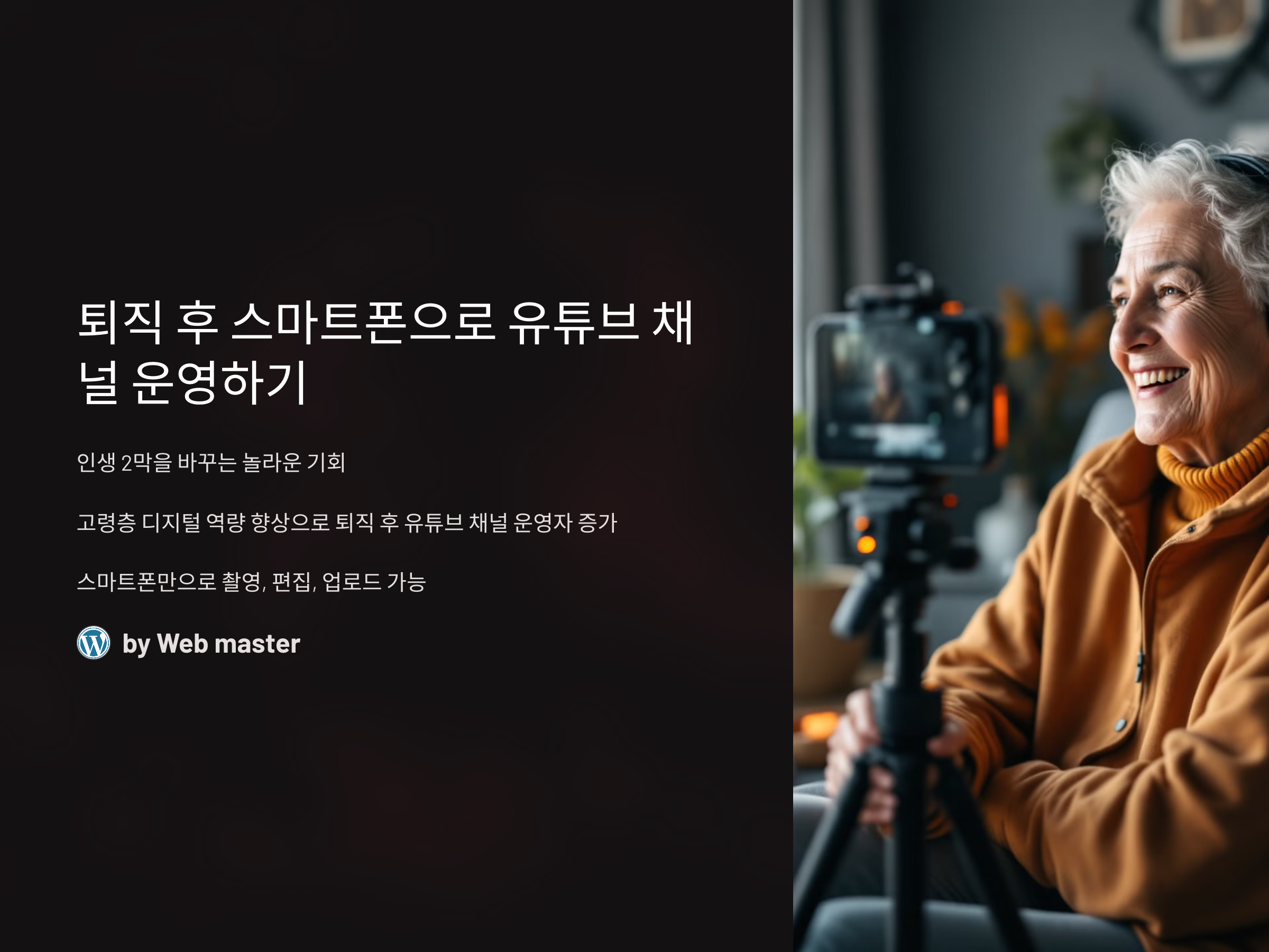 퇴직 유튜브, 시니어 유튜버, 스마트폰 유튜브 시작, 유튜브 수익화, 시니어 콘텐츠, 유튜브 운영 노하우, 브이로그