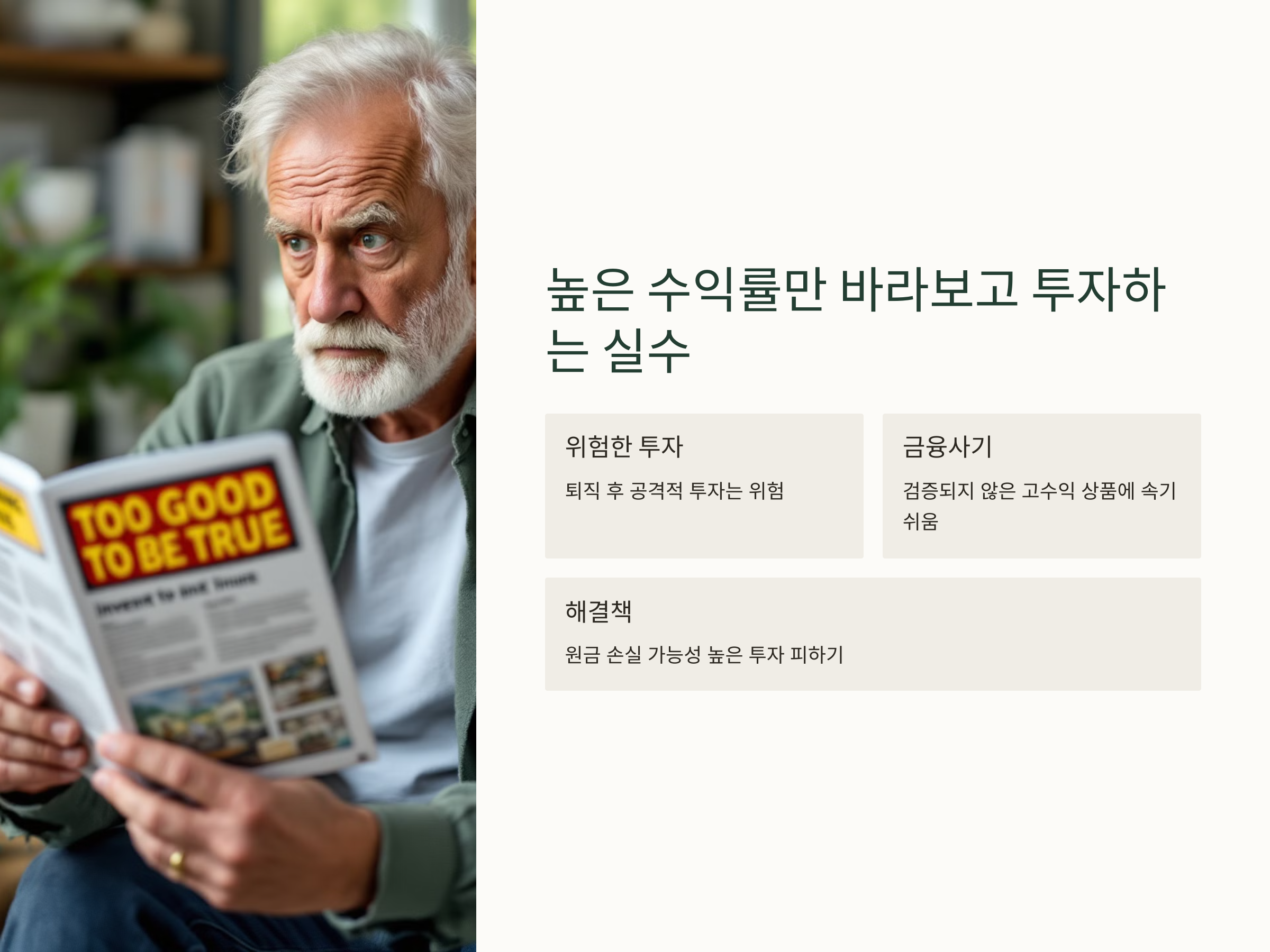 퇴직 후에는 공격적인 투자가 위험할 수 있지만, 여전히 높은 수익률을 목표로 위험한 투자에 뛰어드는 경우가 많습니다. 특히, 검증되지 않은 고수익 투자 상품이나 유사 금융사기에 속기 쉽습니다.