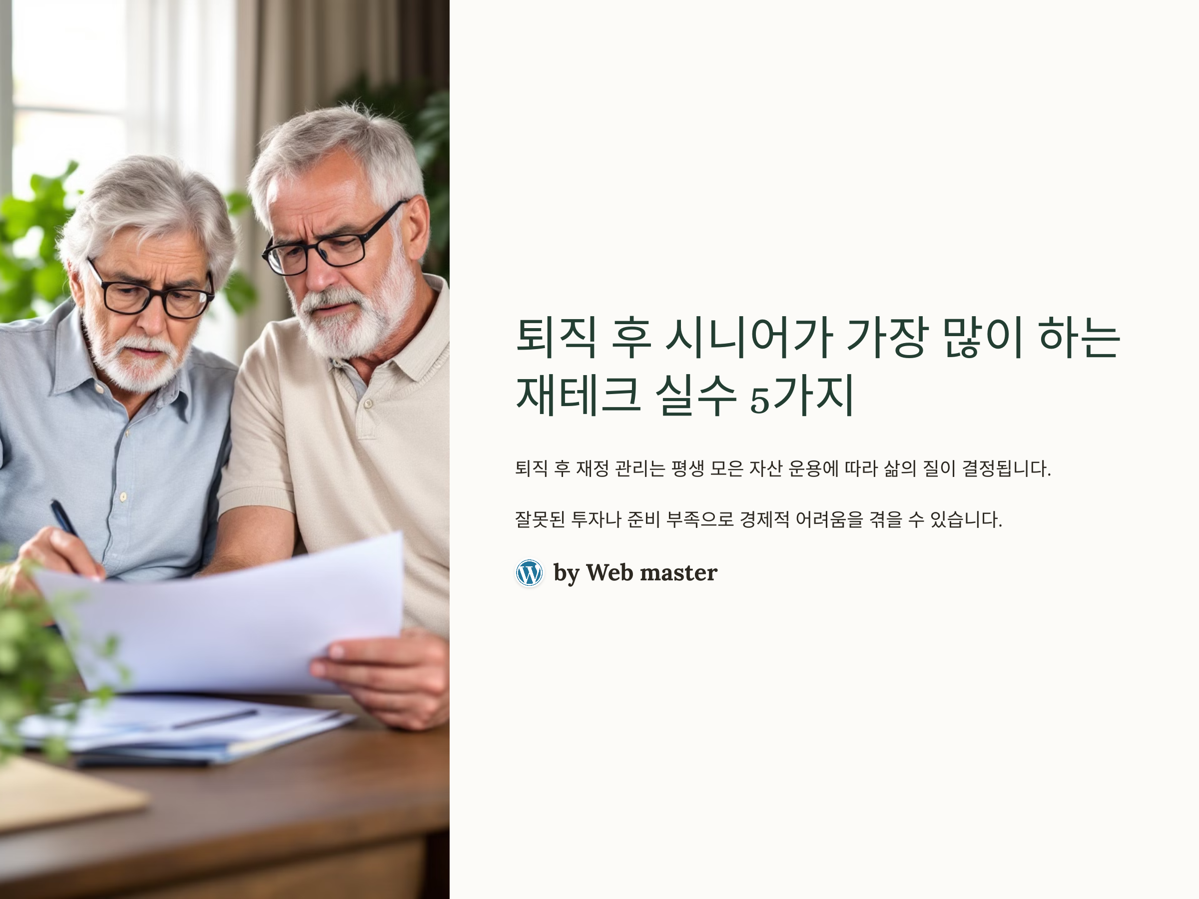 퇴직 후의 재정 관리는 평생 모은 자산을 어떻게 운용하느냐에 따라 삶의 질이 결정됩니다. 하지만 많은 시니어들이 잘못된 투자나 준비 부족으로 인해 경제적인 어려움을 겪기도 합니다. 이번 글에서는 퇴직 후 시니어들이 가장 많이 하는 재테크 실수 5가지와 이를 피하는 방법에 대해 알아보겠습니다.