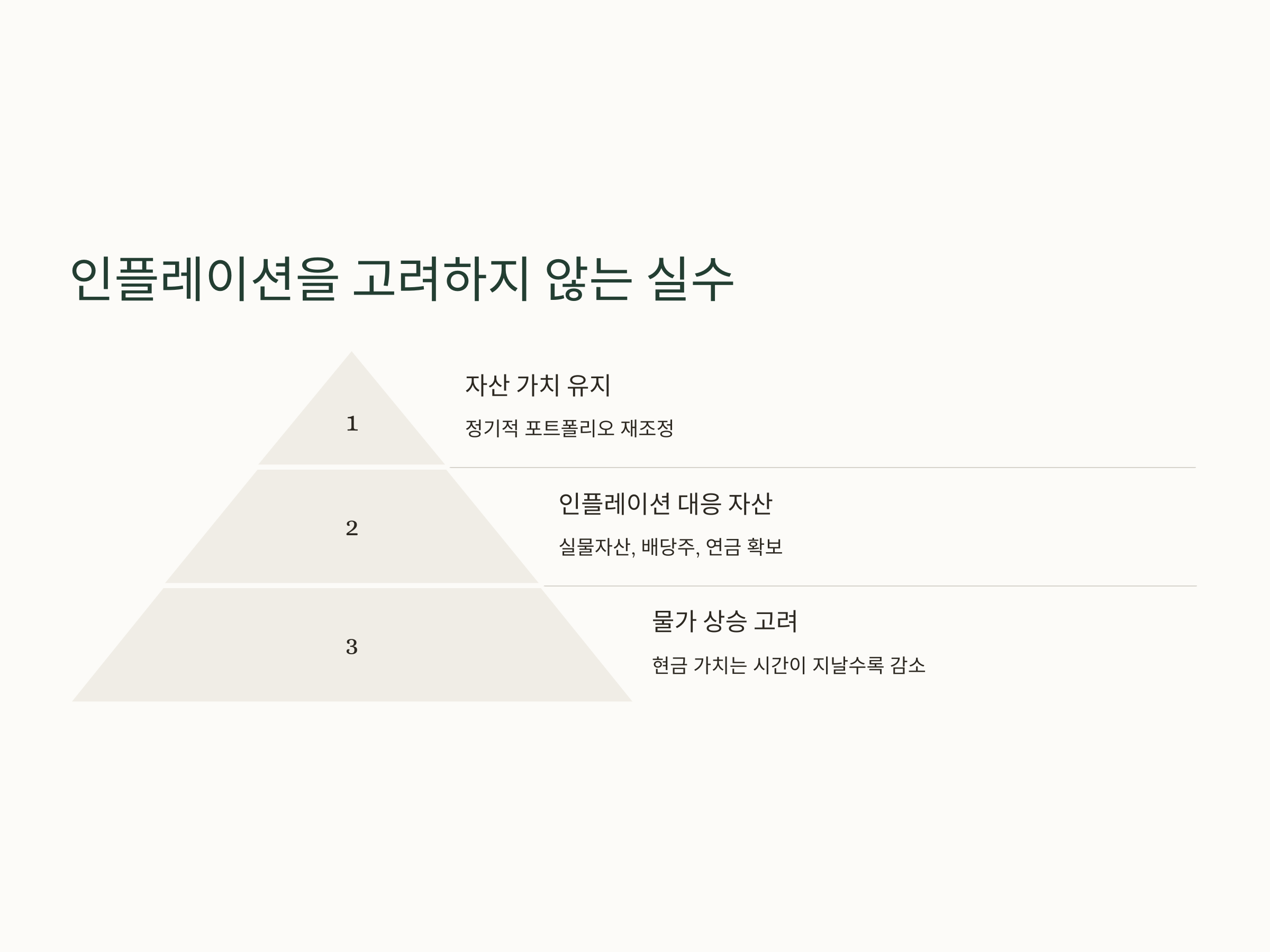 - 실물자산, 배당주, 연금 등 인플레이션을 극복할 수 있는 자산을 확보하세요.