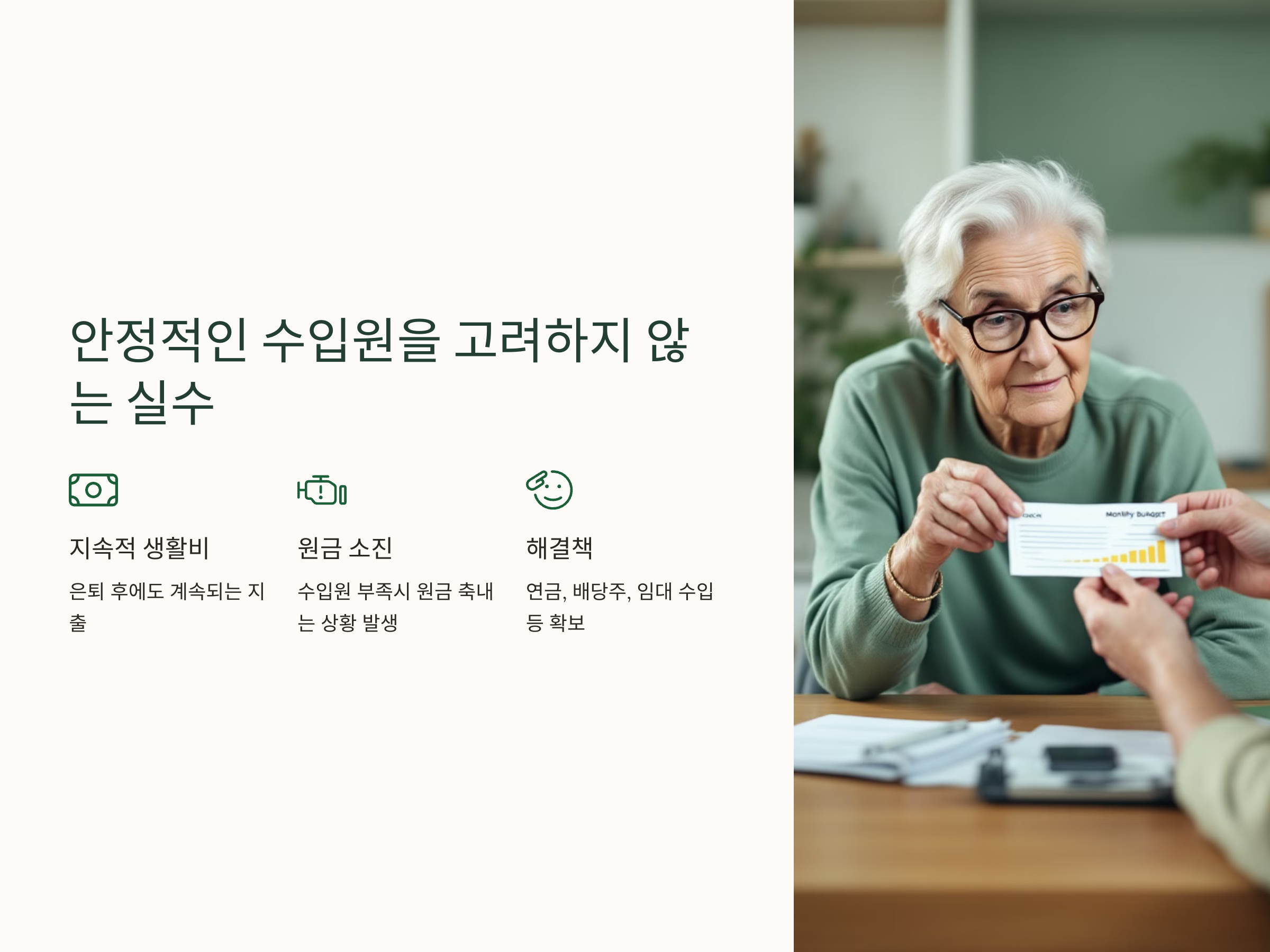 퇴직 후에도 지속적인 생활비가 필요하지만, 많은 시니어들은 이를 고려하지 않고 재테크를 시작합니다. 특히, 은퇴 후의 수입원이 부족한 경우 생활비 충당을 위해 원금을 축내는 상황이 발생할 수 있습니다.