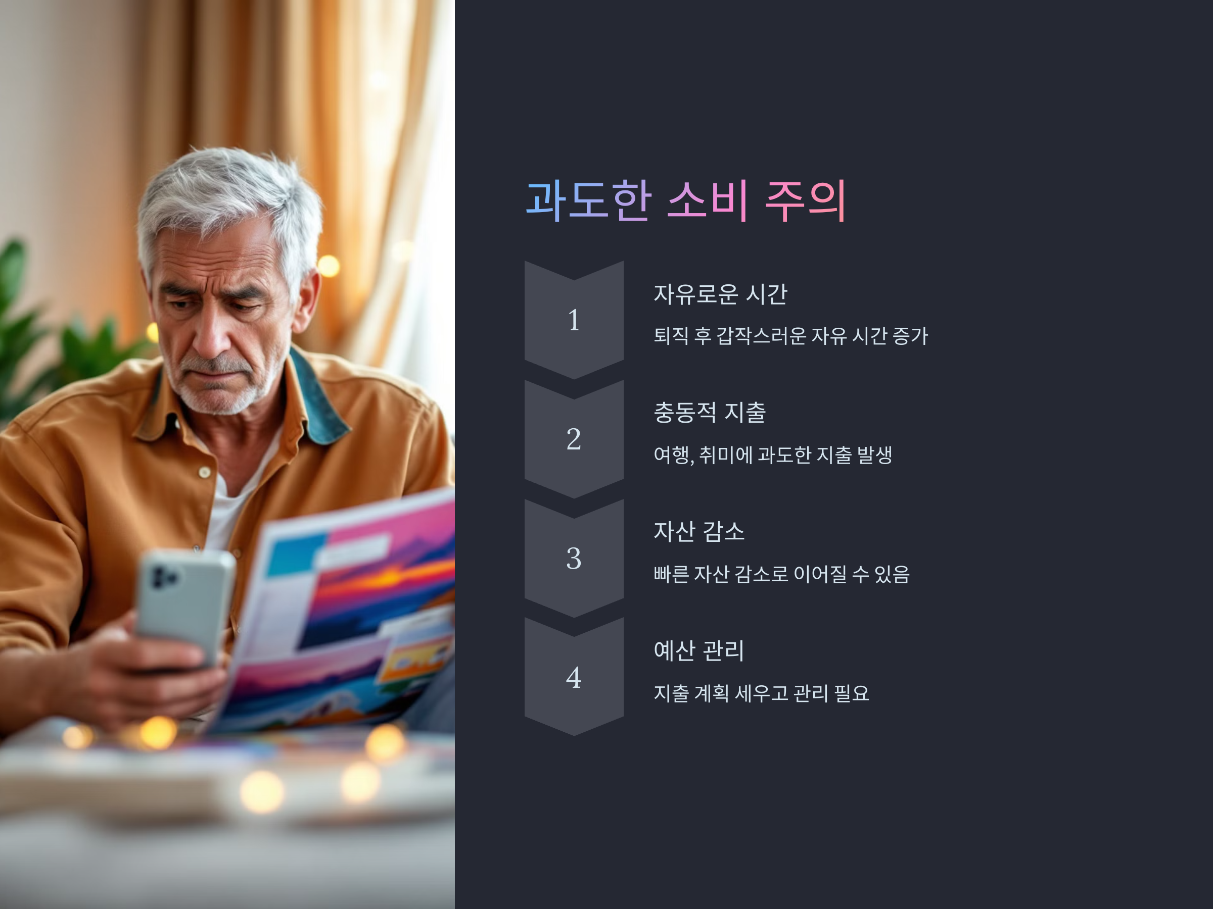 퇴직 후 갑작스러운 자유로 인해 여행, 취미 등에 과도한 지출을 하는 경우가 많습니다. 이는 빠른 자산 감소로 이어질 수 있으므로, 예산을 설정하고 지출을 관리하는 것이 중요합니다.