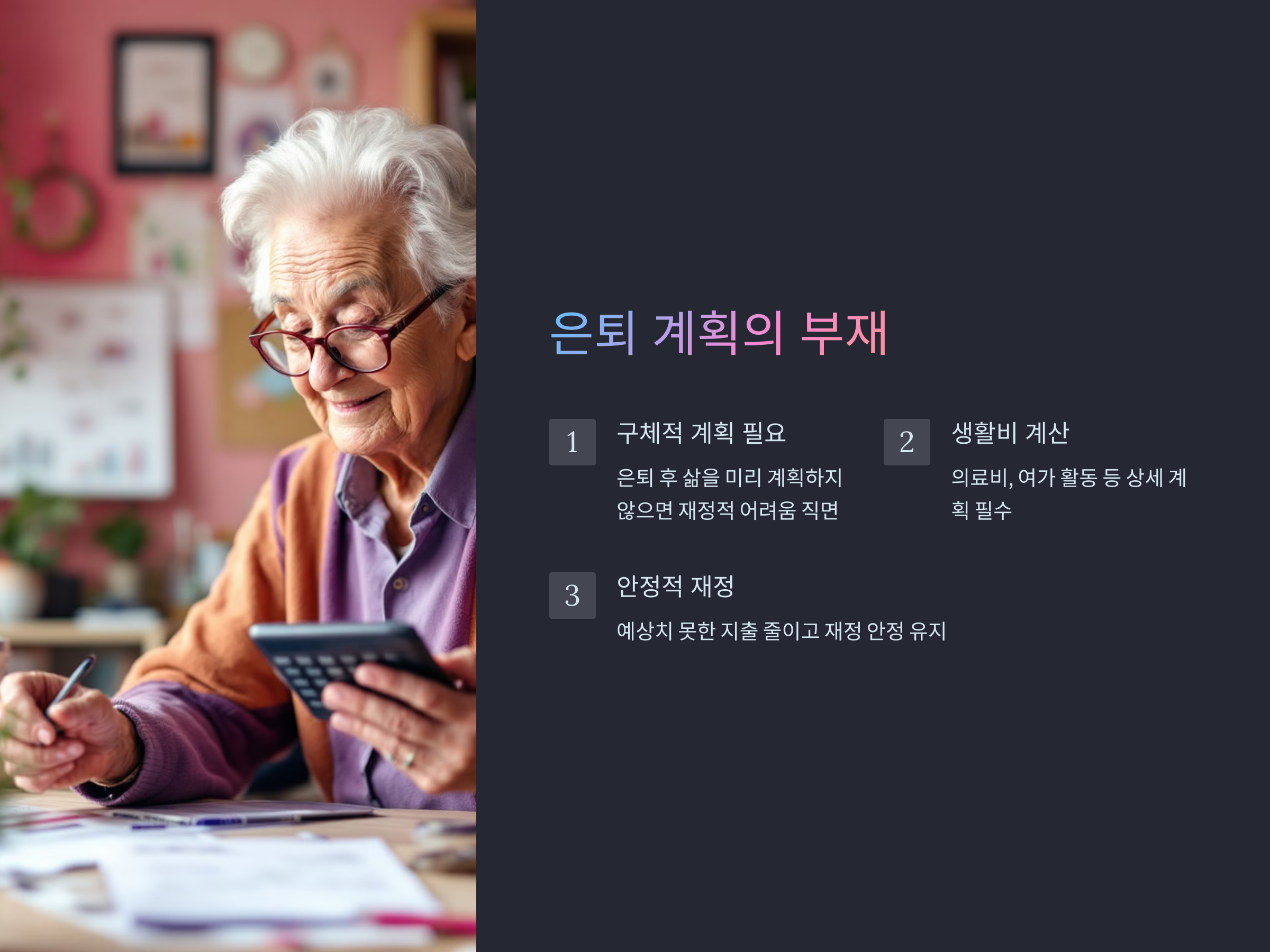 은퇴 후의 삶을 구체적으로 계획하지 않으면 재정적 어려움에 직면할 수 있습니다. 은퇴 전부터 생활비, 의료비, 여가 활동 등에 대한 상세한 계획을 세워야 합니다. 이를 통해 예상치 못한 지출을 줄이고 안정적인 재정을 유지할 수 있습니다.