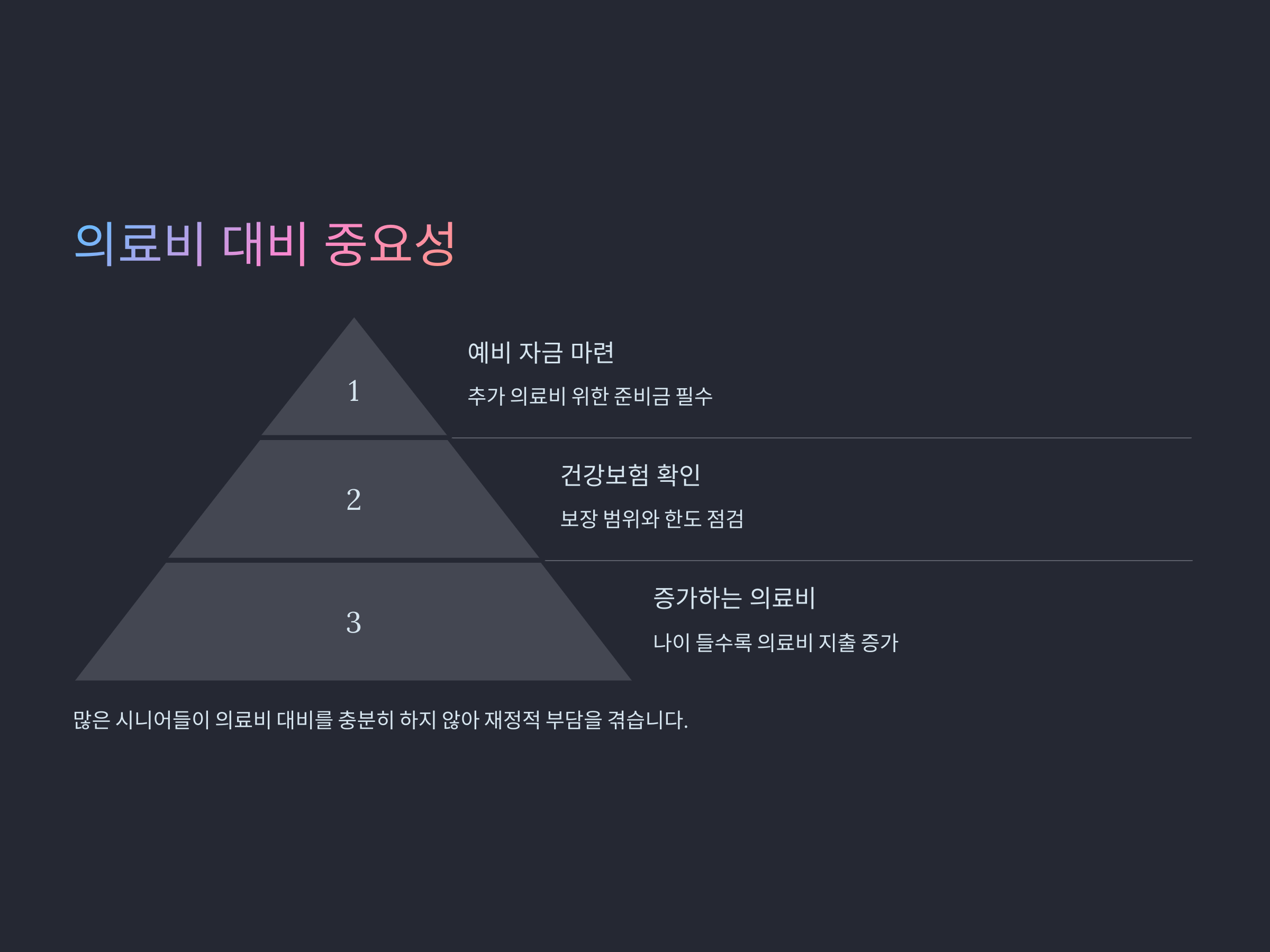 나이가 들수록 의료비 지출이 증가합니다. 그러나 많은 시니어들이 이에 대한 대비를 충분히 하지 않아 재정적 부담을 겪습니다. 건강보험을 확인하고, 추가적인 의료비를 위한 예비 자금을 마련하는 것이 필요합니다.