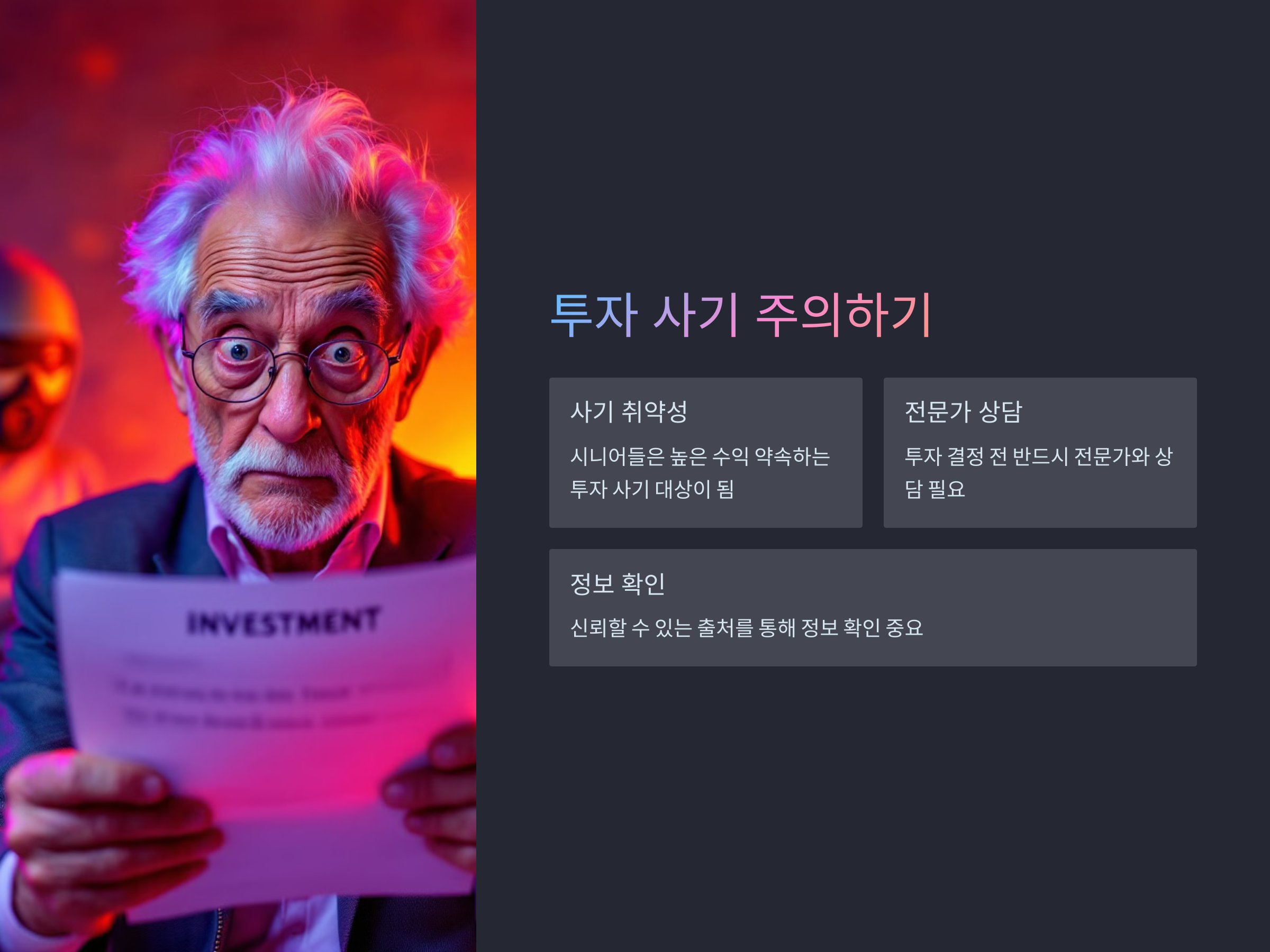 시니어들은 종종 높은 수익을 약속하는 투자 사기의 대상이 됩니다. 투자 결정을 내리기 전에 반드시 전문가와 상담하고, 신뢰할 수 있는 출처를 통해 정보를 확인해야 합니다.