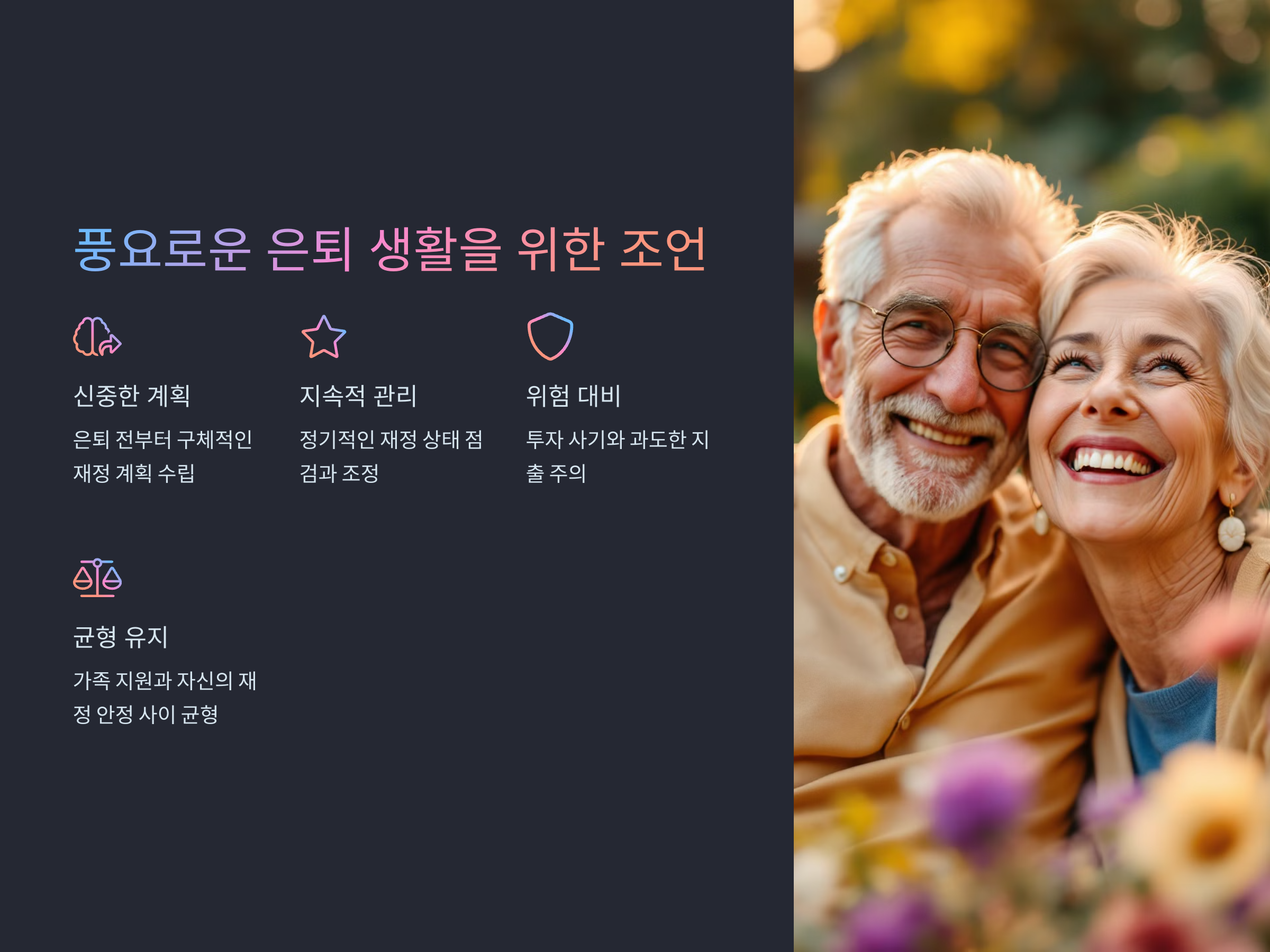 퇴직 후 안정적인 재정을 유지하기 위해서는 신중한 계획과 관리가 필요합니다. 위의 실수를 피하고, 지속적인 재정 관리를 통해 풍요로운 은퇴 생활을 즐기시기 바랍니