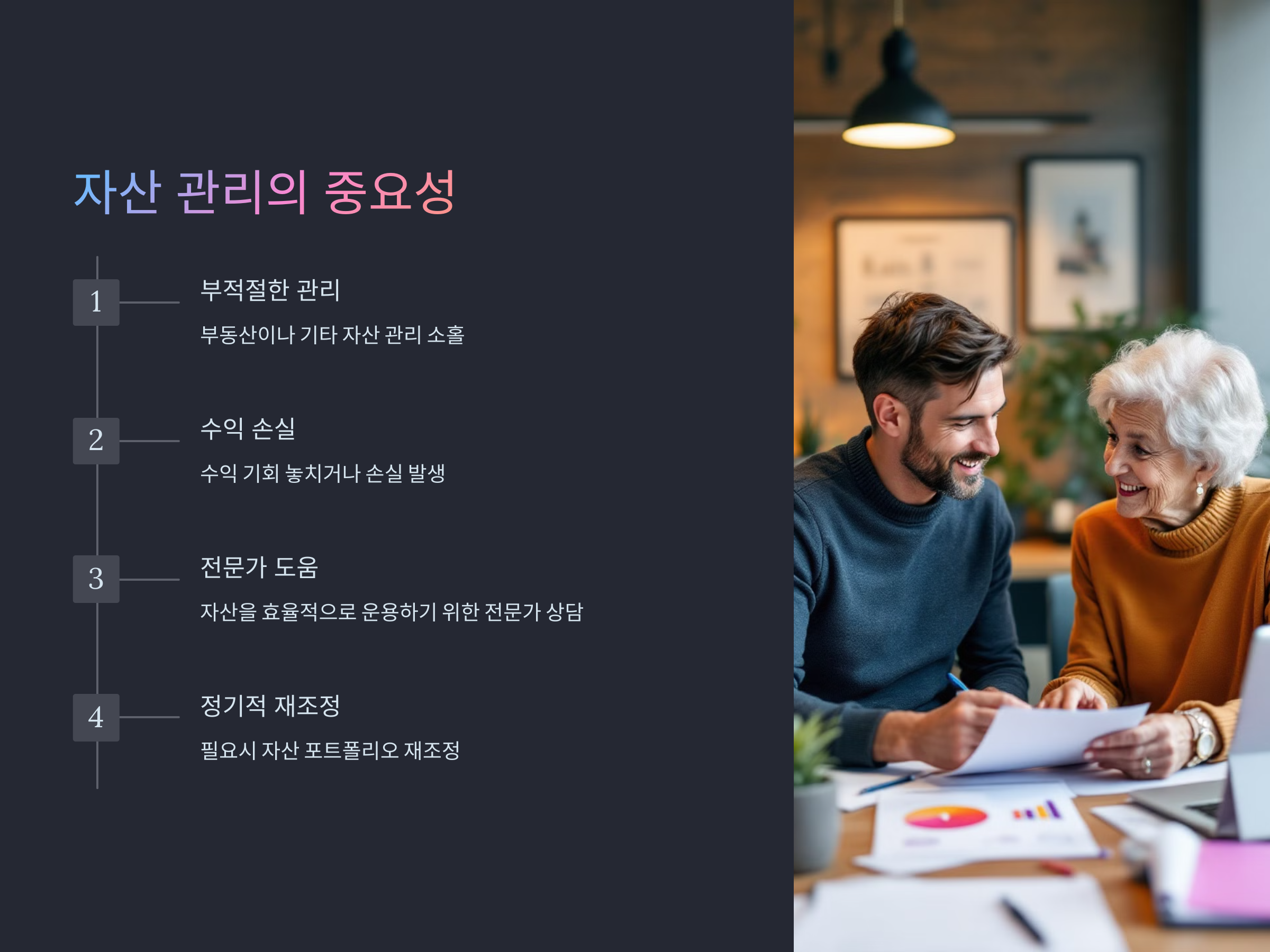 부동산이나 기타 자산을 적절하게 관리하지 않으면 수익을 놓치거나 손실을 볼 수 있습니다. 전문가의 도움을 받아 자산을 효율적으로 운용하고, 필요시 재조정하는 것이 중요합니다.