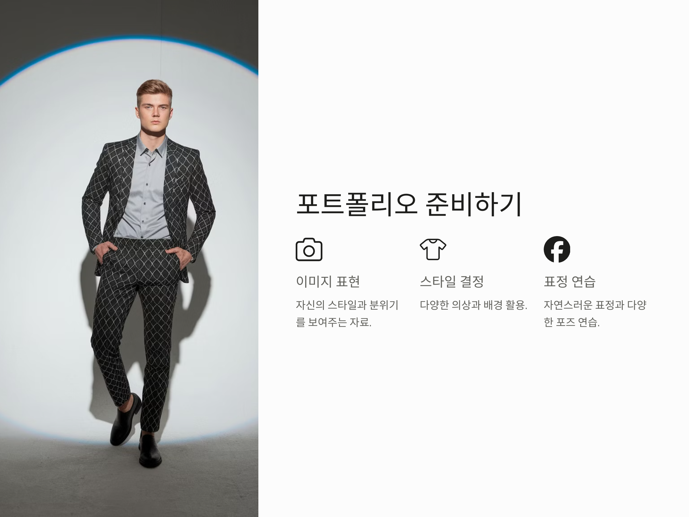 시니어 모델로서 첫 번째 단계는 포트폴리오를 준비하는 것입니다. 모델링에 있어 포트폴리오는 매우 중요한데, 이는 당신의 이미지를 표현하는 주요 자료가 되기 때문입니다. 포트폴리오는 사진을 통해 자신이 어떤 스타일이나 분위기를 가지고 있는지를 보여주는 중요한 역할을 합니다.