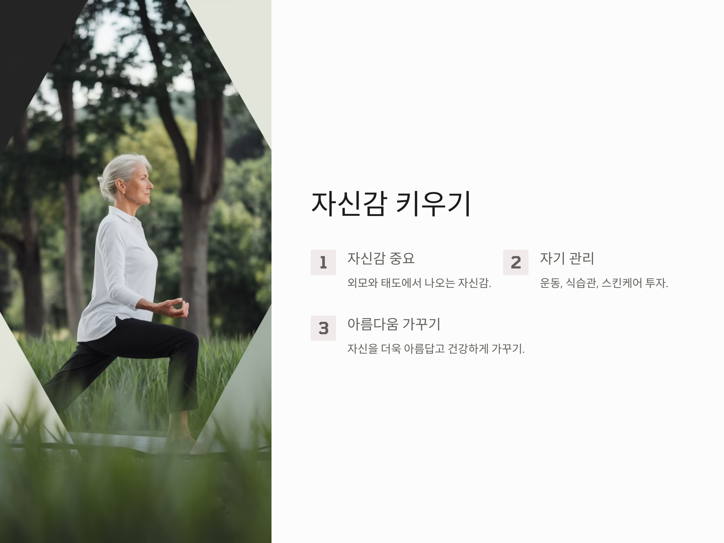 이제 퇴직 후 여유로운 시간을 갖게 된 만큼, 자신을 더욱 아름답고 건강하게 가꾸는 것이 시니어 모델로서 중요한 요소가 됩니다. 꾸준한 운동, 건강한 식습관, 스킨케어 등 자신을 돌보는 데 투자하는 것이 그 첫걸음입니다.