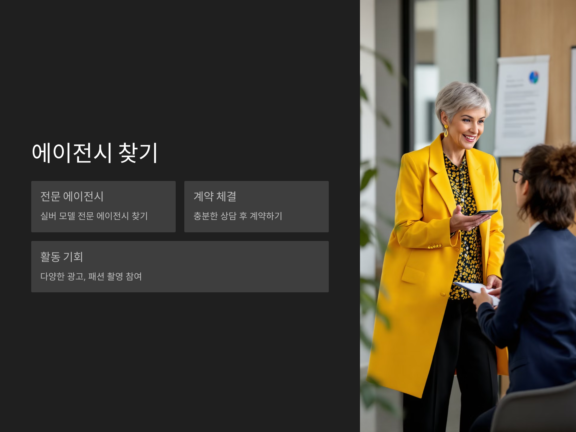 실버 모델 에이전시는 자신의 활동을 적극적으로 도와주기 때문에, 이를 통해 실버 모델로서의 첫 발을 내딛을 수 있는 기회를 얻을 수 있습니다. 에이전시와 계약을 체결한 후에는, 해당 에이전시의 지침을 따르면서 다양한 광고나 패션 촬영에 참여할 수 있습니다. 물론, 에이전시와 계약 전에는 자신이 어떤 일을 할 수 있을지 충분히 상담을 받는 것이 좋습니다.