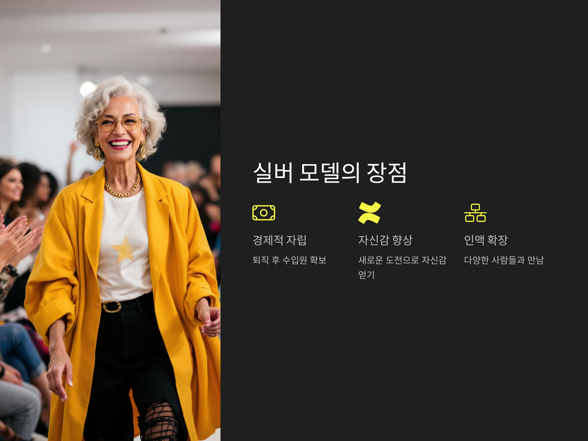 퇴직 후 실버 모델로 활동하는 것은 경제적 자립을 이룰 수 있는 기회가 될 수 있습니다. 또한, 모델로 활동하는 동안 자신감을 얻고, 새로운 사람들을 만나며 다양한 경험을 쌓을 수 있는 기회가 됩니다. 실버 모델은 그 자체로 많은 사람들에게 영감을 주며, 나이가 많다고 해서 도전할 수 없는 일이 아니라는 것을 보여줄 수 있습니다.