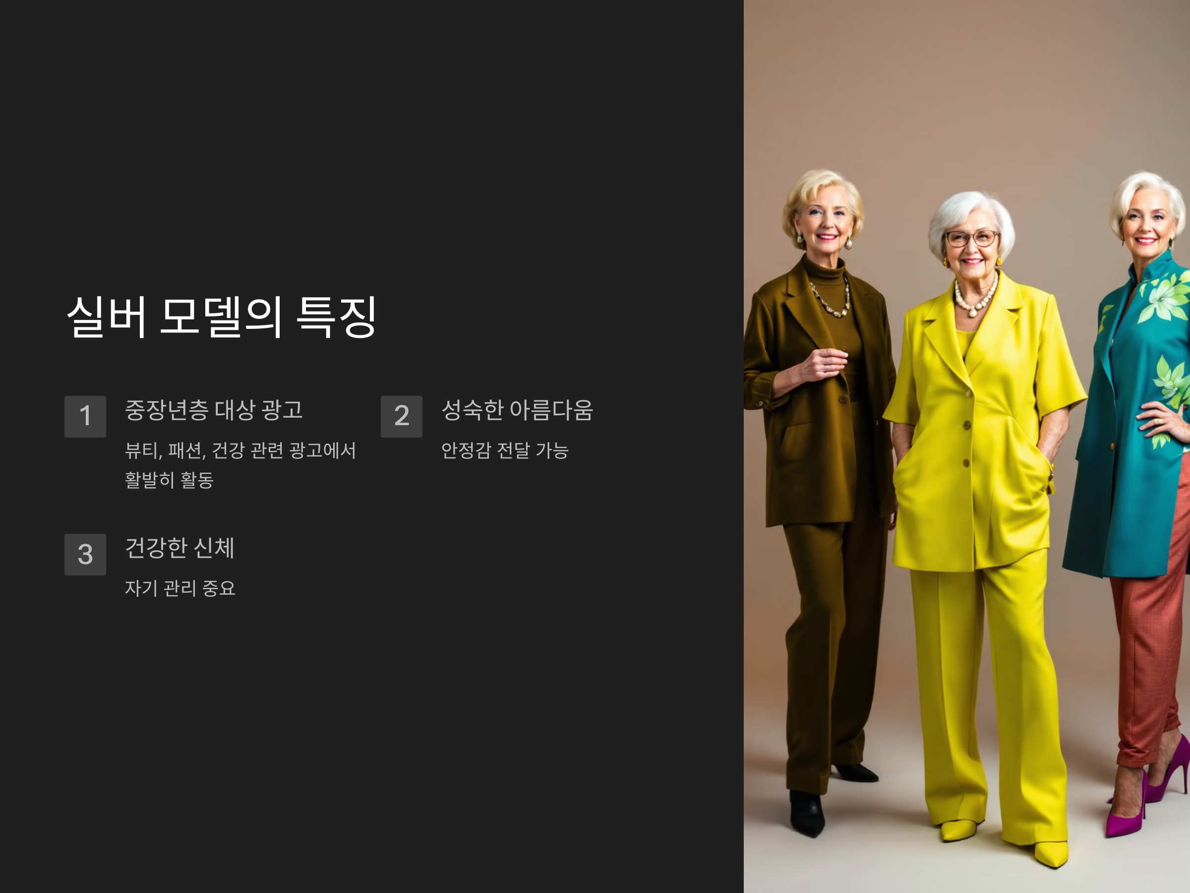 실버 모델은 일반적인 모델들과는 다르게, 나이가 많은 연령대의 사람들로 이루어진 모델입니다. 실버 모델을 필요로 하는 분야는 주로 중장년층을 대상으로 하는 광고나 캠페인에 많이 등장합니다. 최근에는 중장년층을 타겟으로 한 뷰티, 패션, 건강 관련 광고에서 활발히 활동하는 실버 모델들의 모습도 자주 볼 수 있습니다. 이처럼 실버 모델의 수요는 점점 증가하고 있습니다.