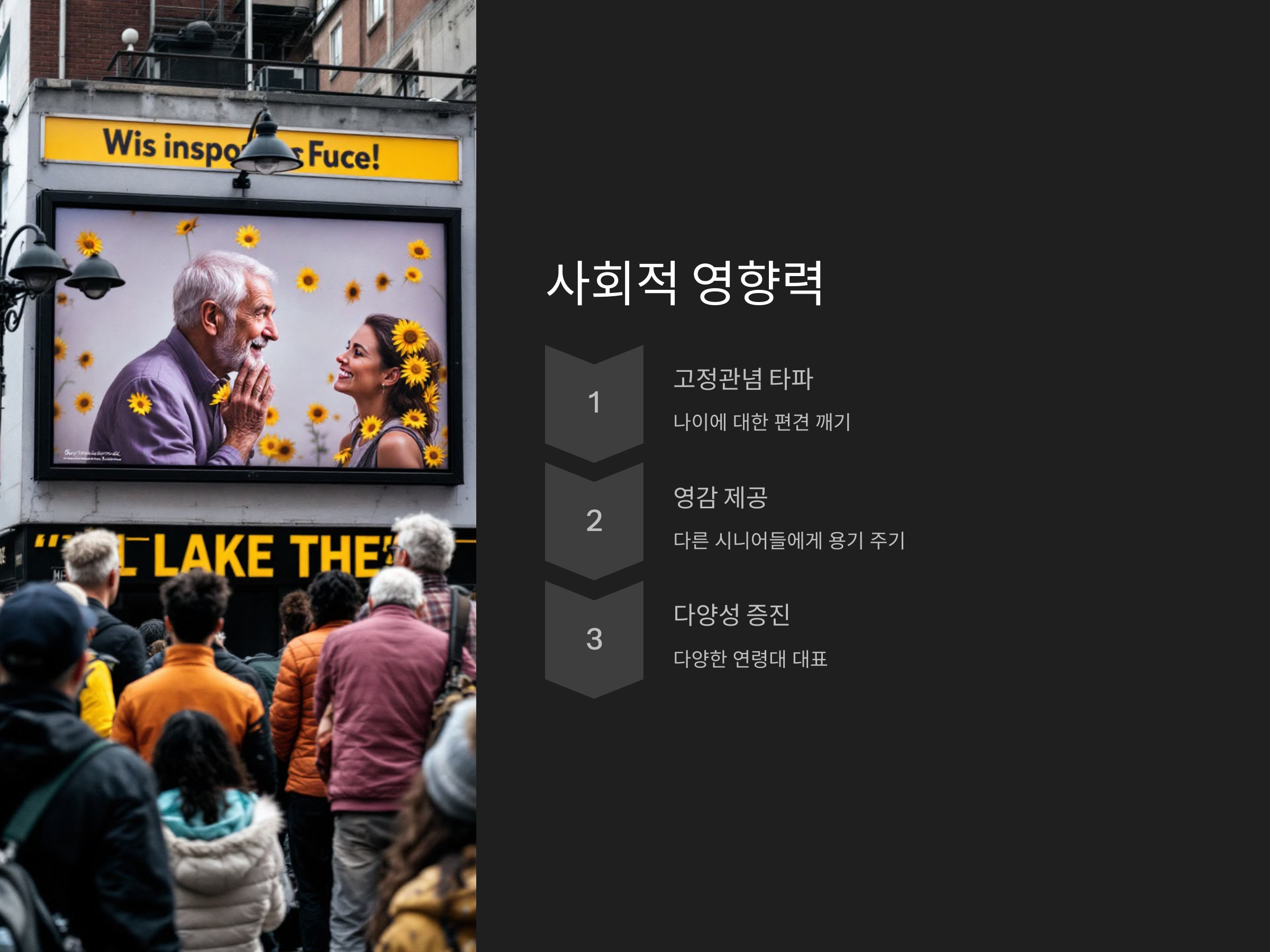 실버 모델로 활동하는 것은 단순히 외모를 강조하는 것이 아니라, 인생 경험을 토대로 하는 다양한 이야기를 전달하는 일입니다. 이러한 활동을 통해 광고주들에게 강력한 메시지를 전달하고, 더 많은 사람들이 나이에 대한 고정관념을 버릴 수 있도록 도울 수 있습니다. 또한, 실버 모델로 활동하는 것은 인생의 또 다른 기회를 열어주는 계기가 될 수 있습니다.