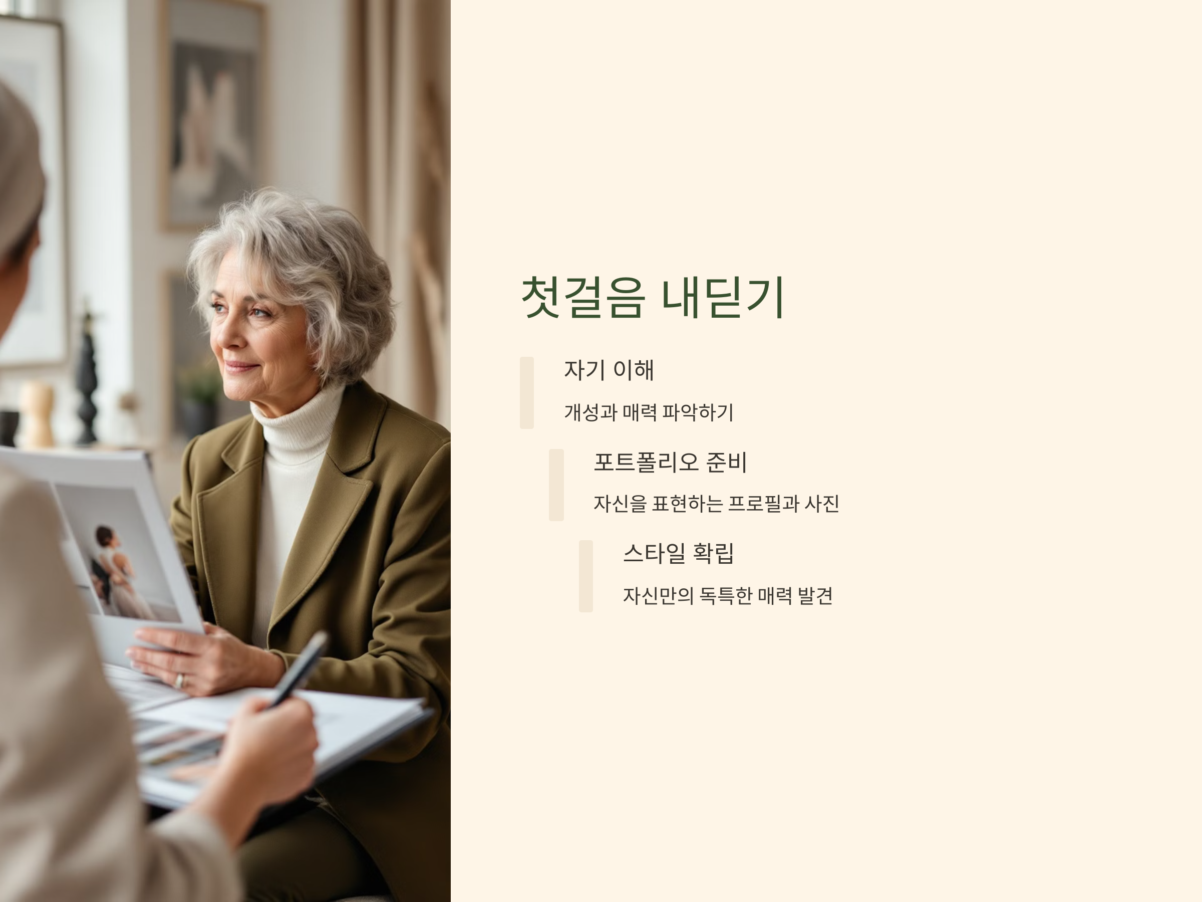 퇴직 후 실버 모델로 도전하기 위한 첫 번째 단계는 '자기 자신을 잘 이해하는 것'입니다. 나이가 들면서 자신에 대한 이미지나 외모에 대한 불안감이 있을 수 있지만, 그럼에도 불구하고 자신의 개성과 매력을 강조하는 것이 중요합니다. 다양한 광고나 캠페인에서 자신이 어떤 스타일을 보여줄 수 있을지 고민해 보세요.