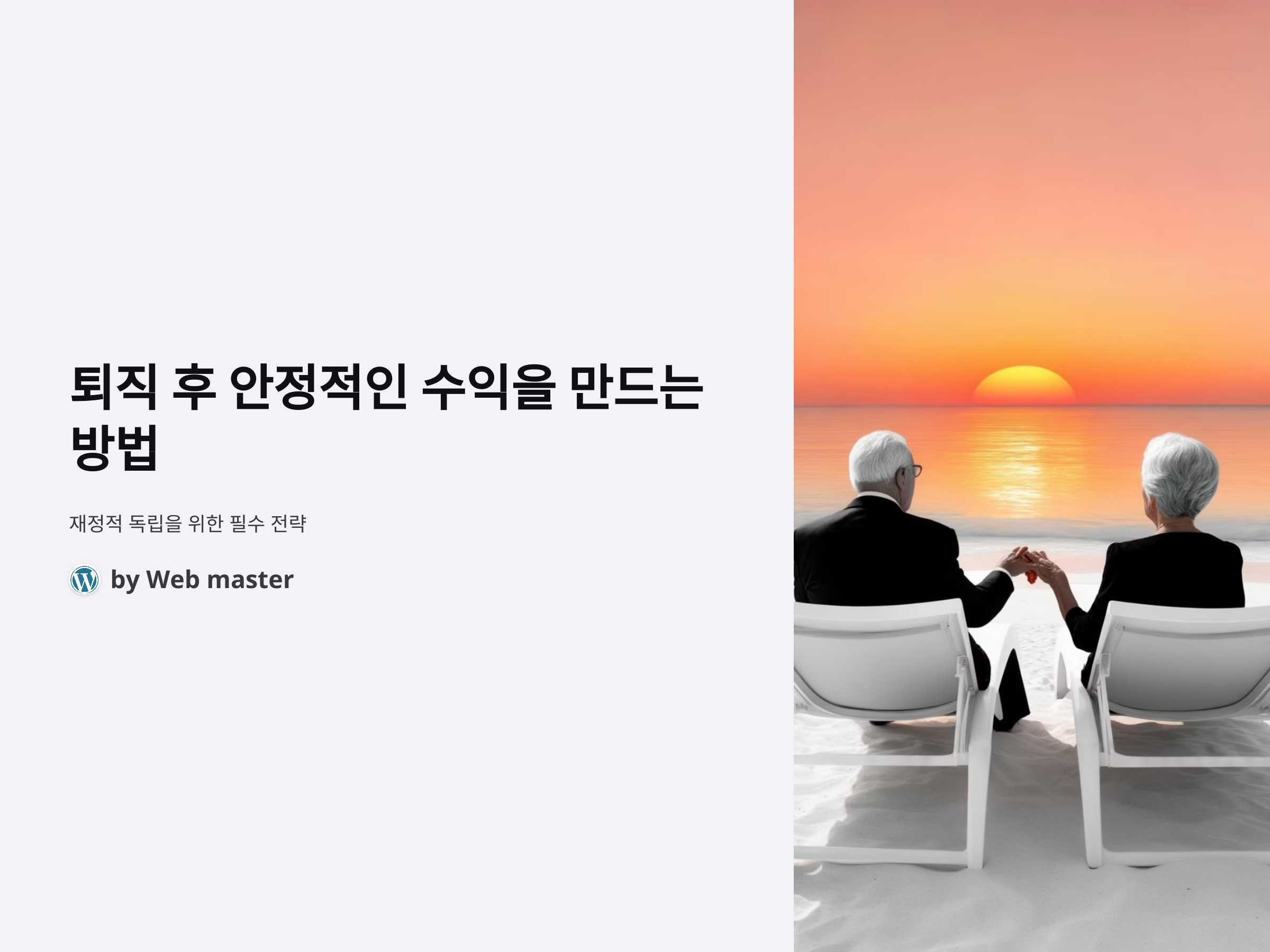 퇴직 후에도 경제적으로 안정적인 삶을 유지하고 싶다면, 그에 맞는 전략적인 계획이 필요합니다. 은퇴 후 생활비를 충분히 감당할 수 있는 수익원은 무엇이 있을까요? 많은 사람들이 퇴직 후에도 경제적 자유를 꿈꾸지만, 이를 실현하기 위한 구체적인 방법을 모르는 경우가 많습니다. 그렇다면 퇴직 후 안정적인 수익을 만드는 방법에 대해 알아보겠습니다.