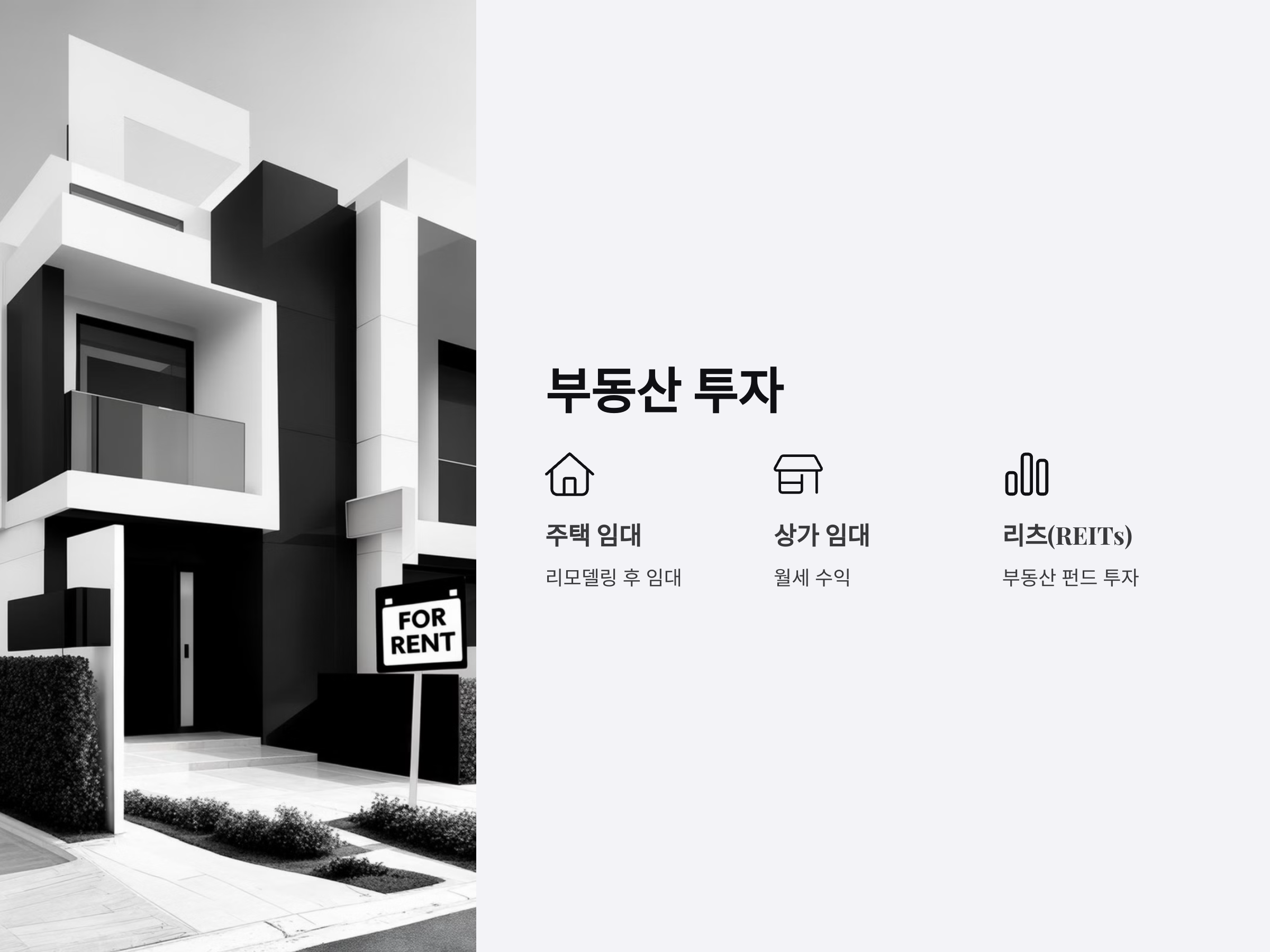 - 주택 임대: 오래된 아파트나 주택을 구입한 후 리모델링하여 임대하는 방법입니다. 초기 비용은 들지만, 수년간 안정적인 임대 수익을 창출할 수 있습니다.