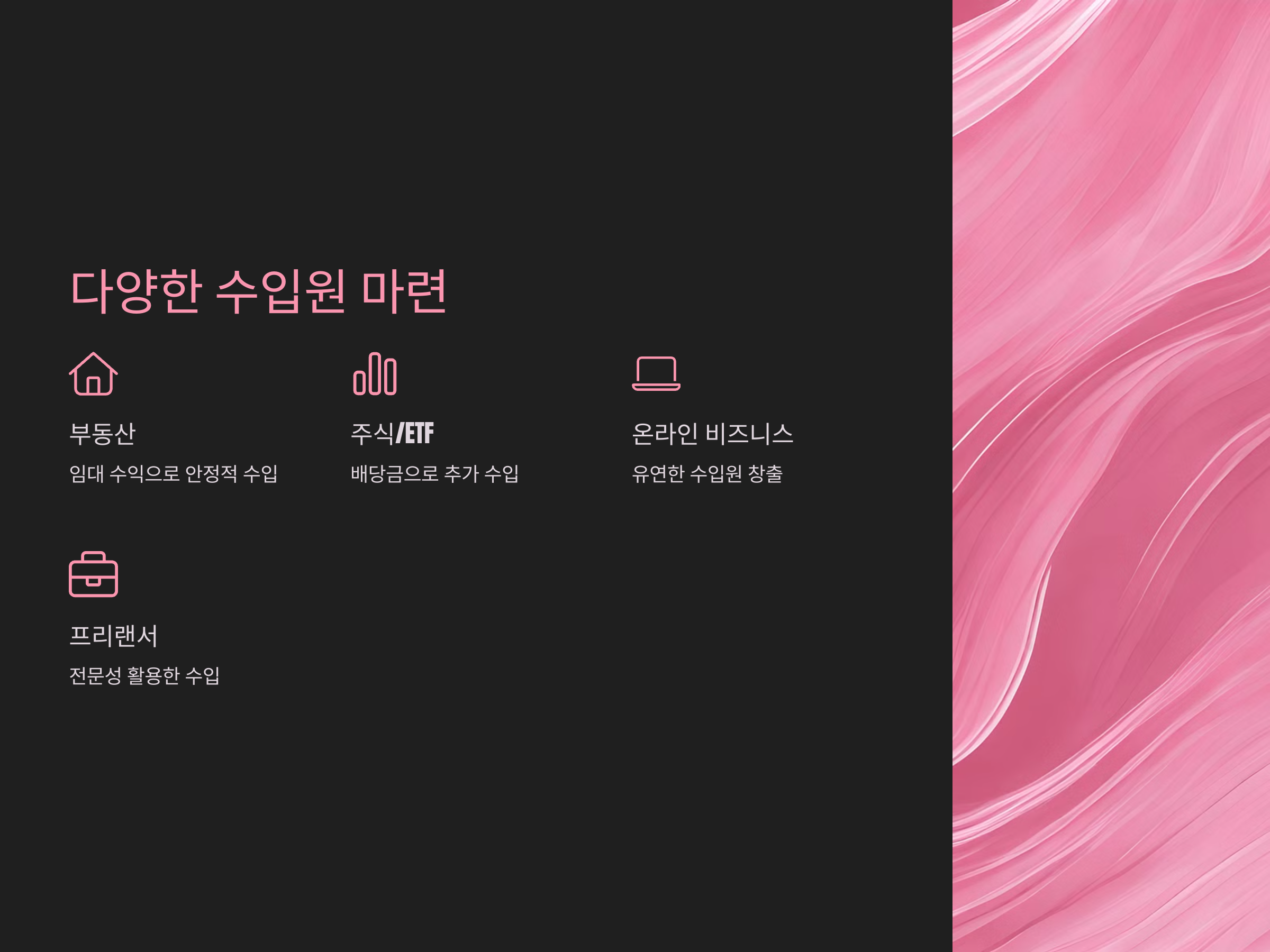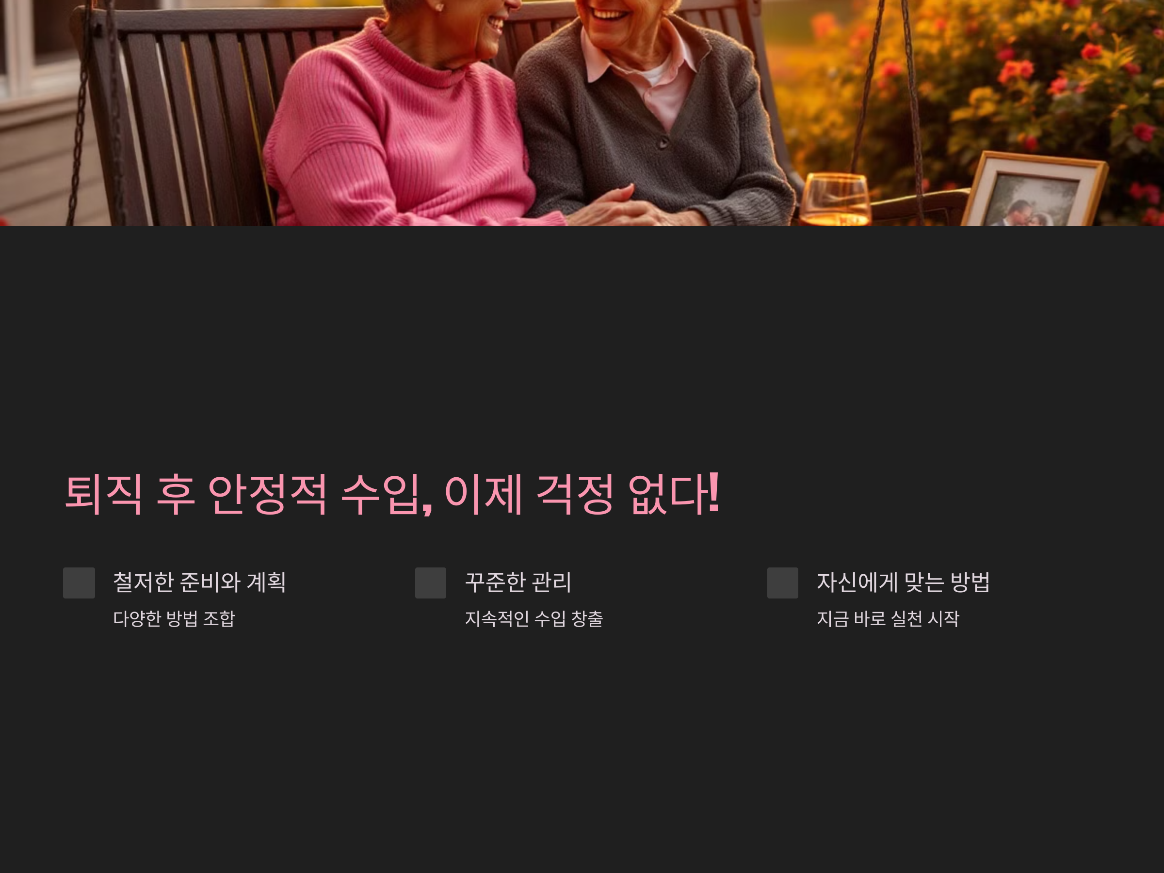 이렇게 철저하게 재정 계획을 세우고, 예상 가능한 수입원을 미리 준비해 두면 은퇴 후에도 안정적인 월 수입을 유지할 수 있습니다.