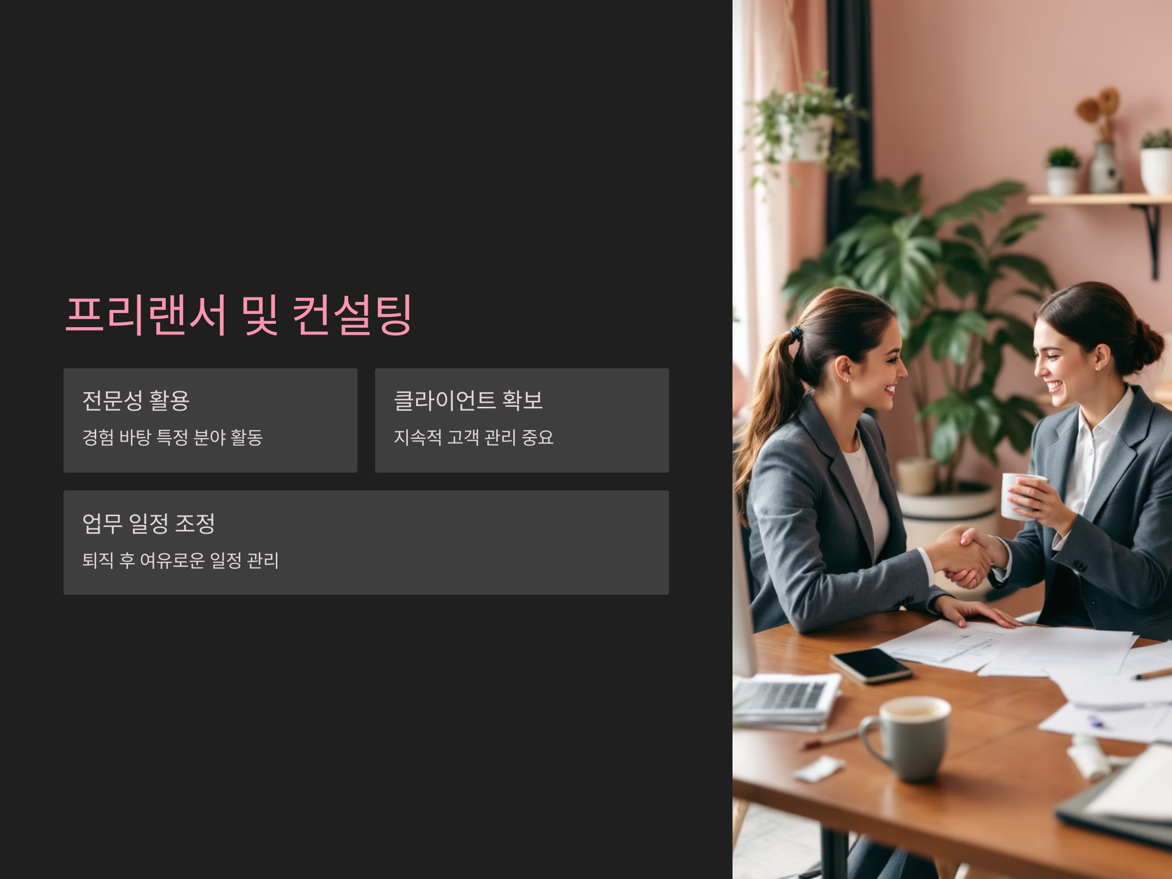 프리랜서나 컨설팅 업무는 퇴직 후에도 계속해서 경제적 자립을 할 수 있는 좋은 방법입니다.