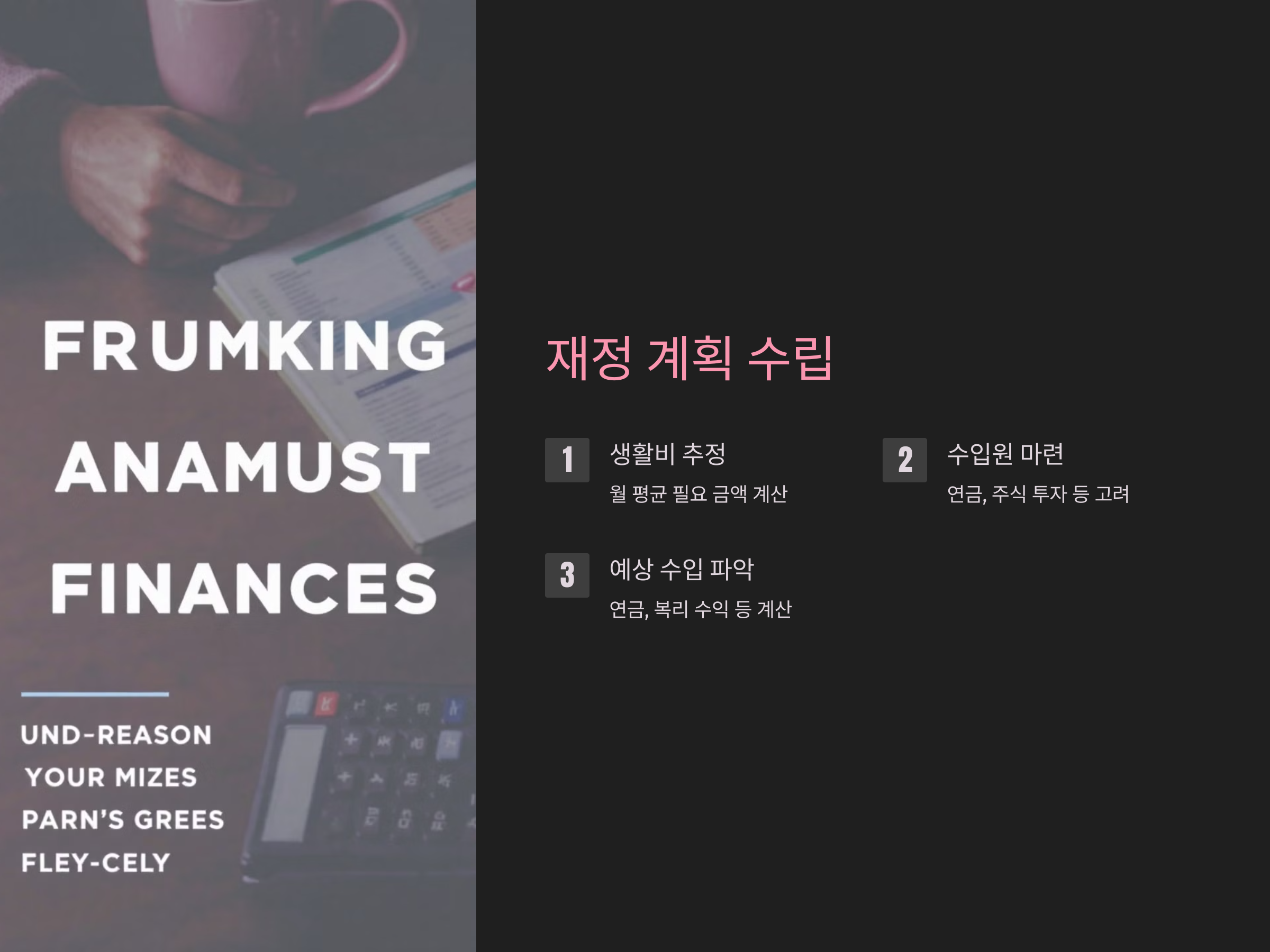 재정 계획 수립의 첫 단계는 생활비 추정입니다. 각종 경비와 예기치 않은 지출까지 감안하여, 월 평균 얼마가 필요한지 계산하는 것이 중요합니다. 그 후, 이를 충족할 수 있는 수입원을 마련해야 합니다. 예를 들어, 연금이나 주식 투자를 통해 매달 일정 금액을 안정적으로 받을 수 있는 방법을 고려해야 합니다.