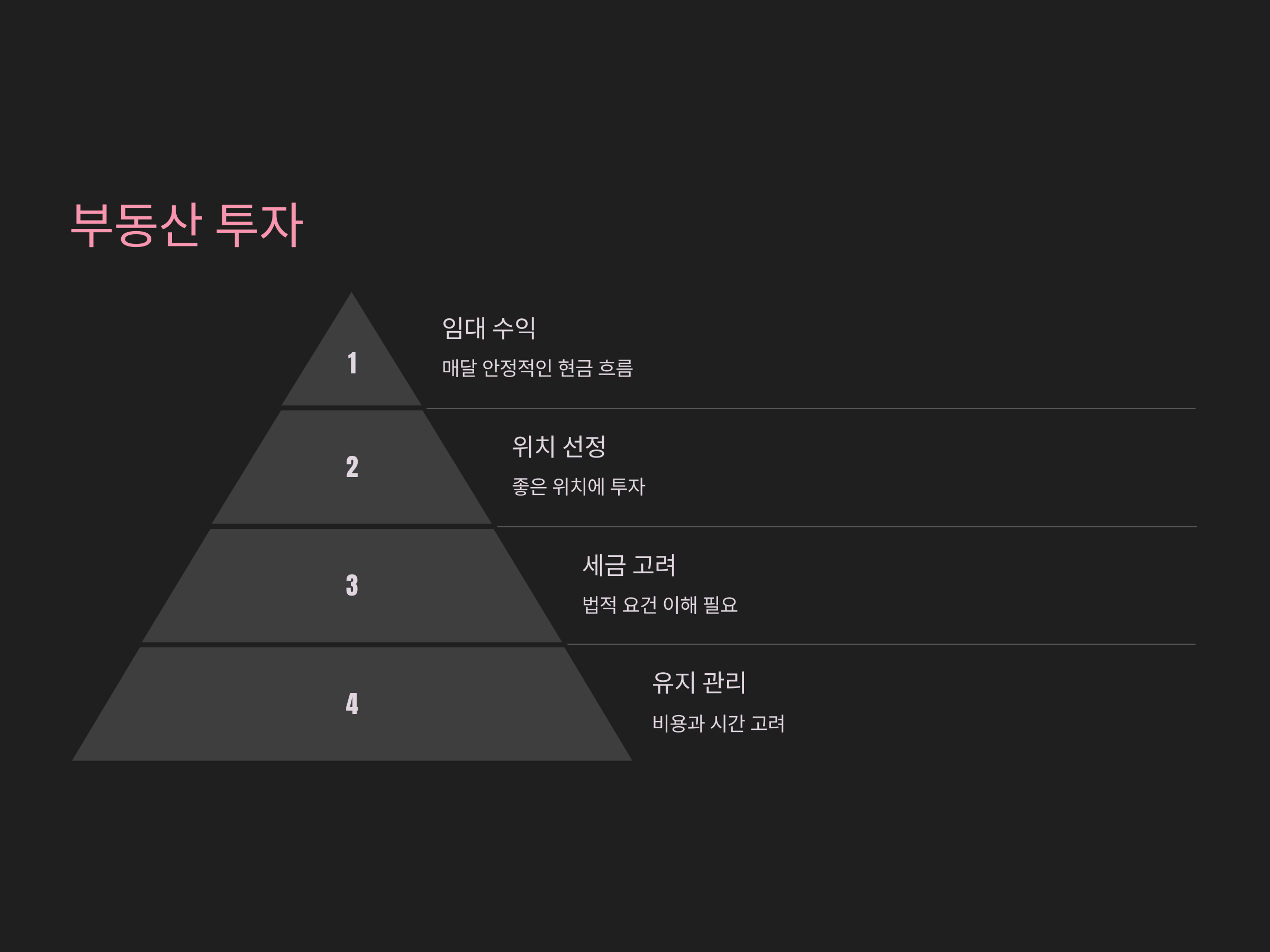 - 위치: 좋은 위치에 투자해야 안정적인 수입을 기대할 수 있습니다.