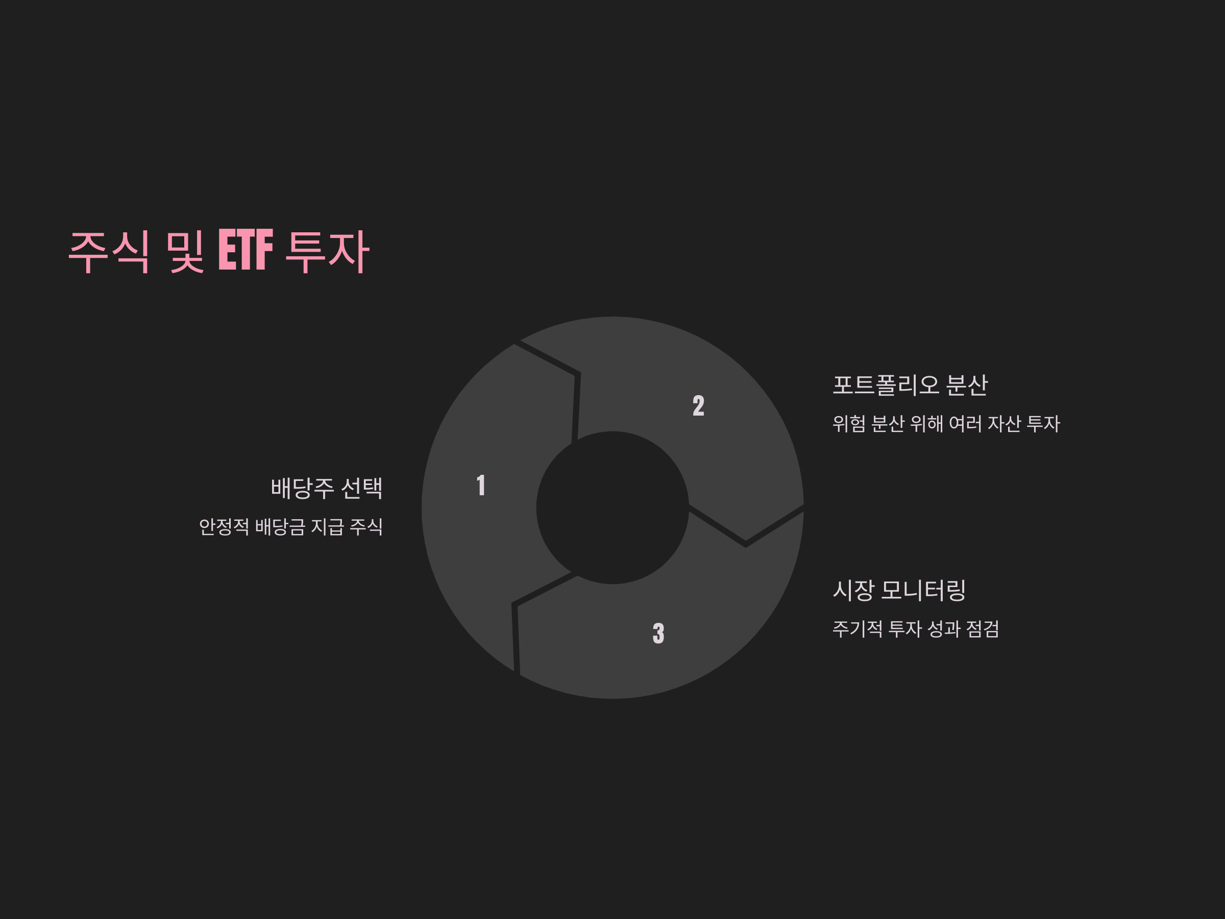 주식 및 ETF 투자는 부동산보다 적은 초기 자본으로도 시작할 수 있는 장점이 있습니다. 이 방법은 잘 활용하면 안정적인 월 수입을 기대할 수 있는 좋은 방법입니다.