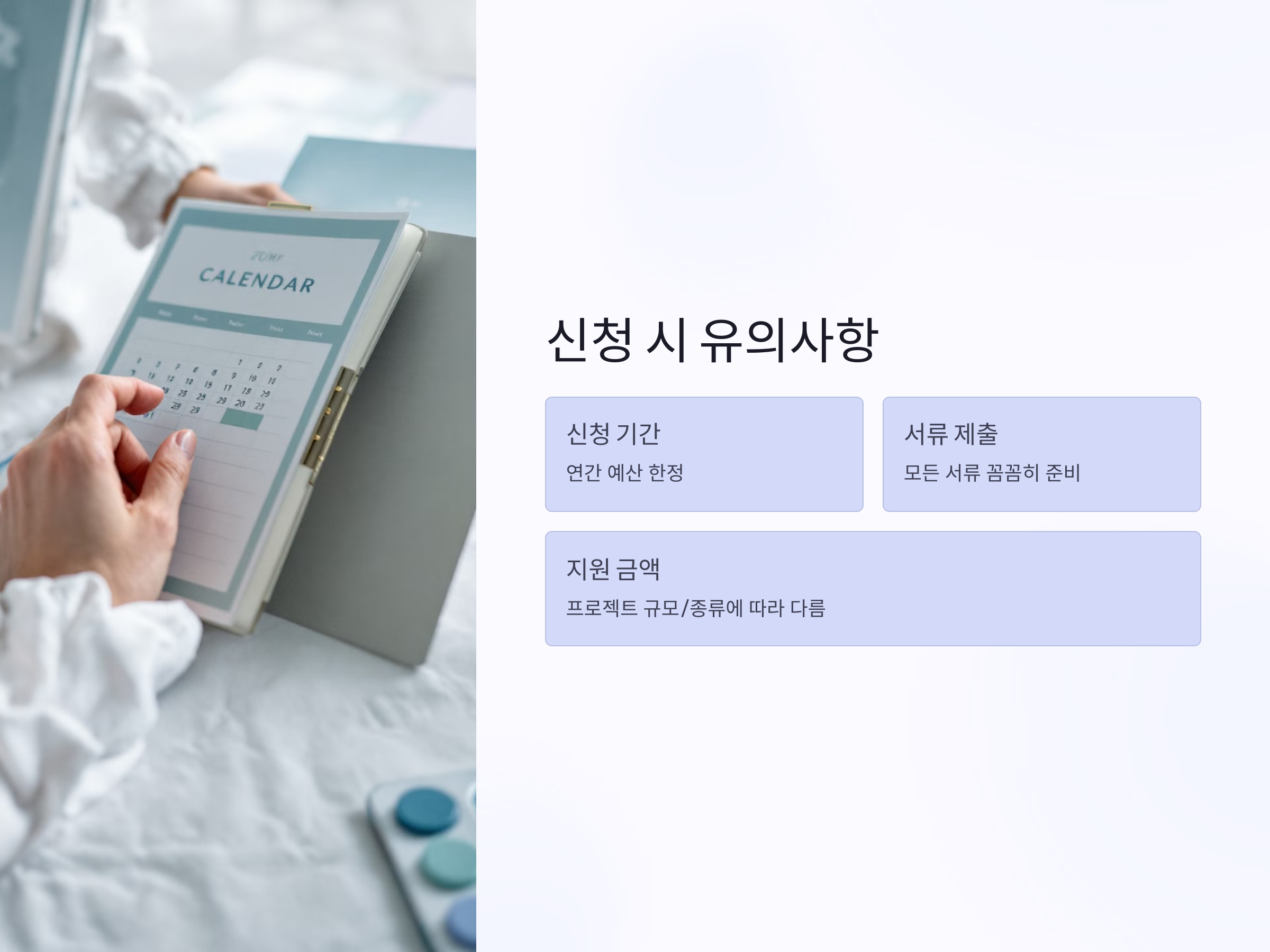 - 지원 금액: 지원금은 프로젝트의 규모나 종류에 따라 다릅니다. 자신이 신청할 프로젝트에 맞는 지원 금액을 확인하고, 추가 비용을 부담할 준비도 해야 합니다.
