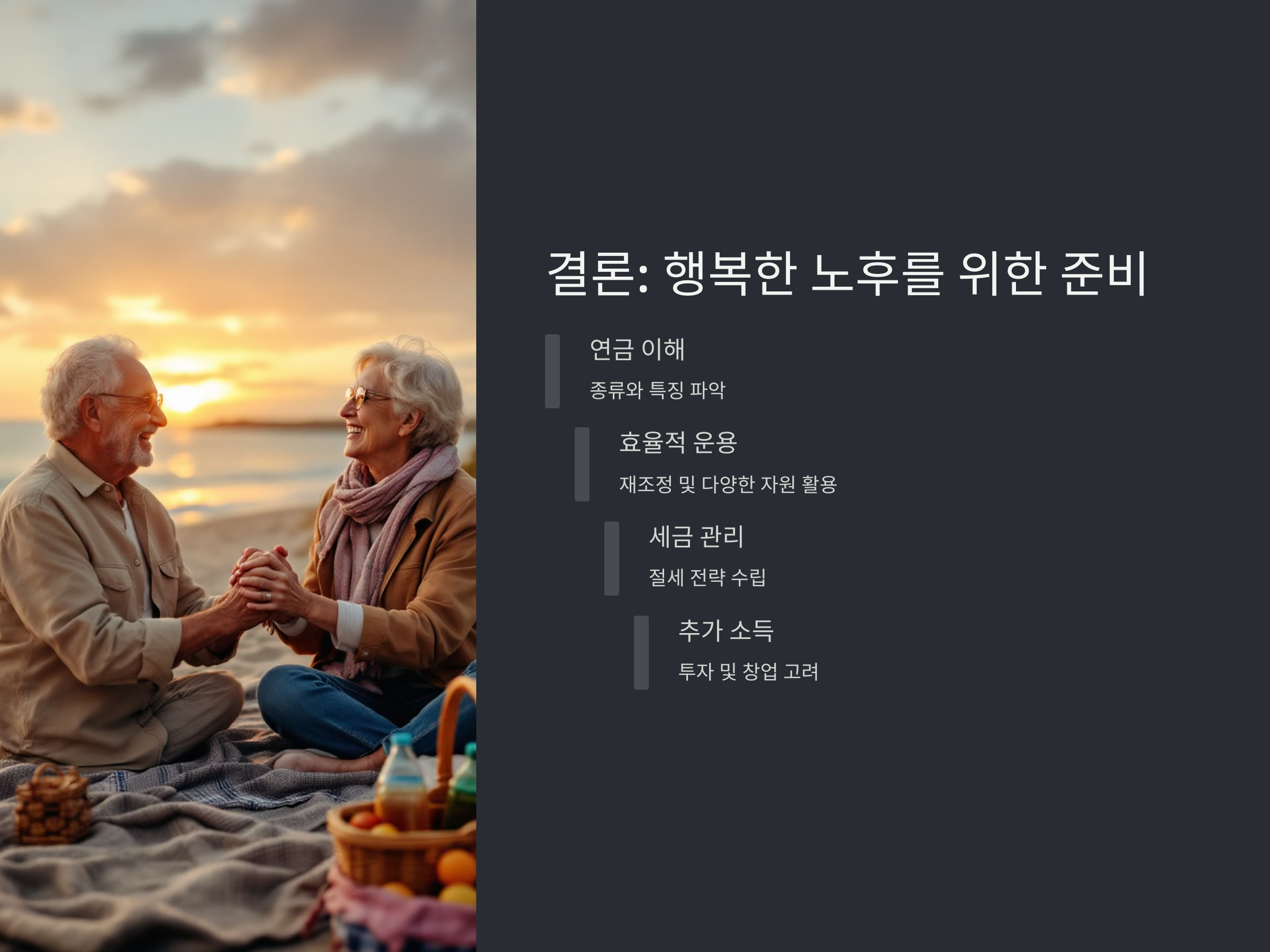 퇴직 후 연금을 효율적으로 활용하는 방법은 개인의 재정 상황과 목표에 따라 달라집니다. 연금의 종류를 잘 이해하고, 이를 효과적으로 운용하는 것이 중요합니다. 또한, 연금 외에도 다양한 재정 자원을 활용하고, 세금 관리 전략을 세우는 것이 필요합니다.