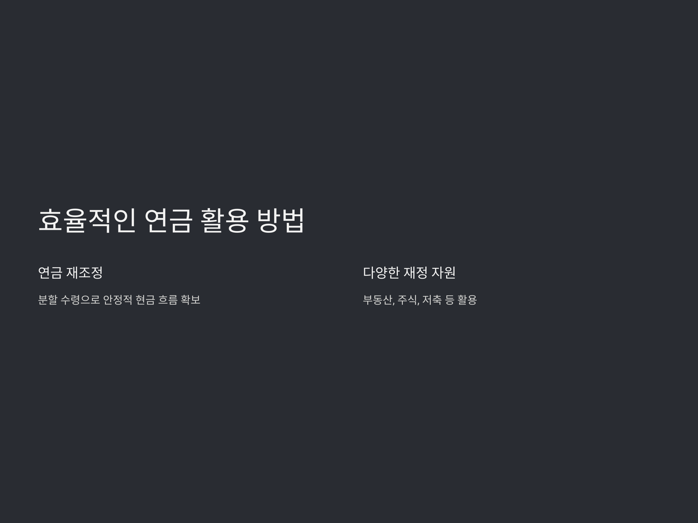 퇴직 후 연금을 효율적으로 활용하기 위한 전략은 크게 두 가지로 나눌 수 있습니다: 연금의 재조정과 다양한 재정 자원의 활용입니다. 연금 외에도 다양한 자산을 고려하여 종합적으로 관리하는 것이 중요합니다.