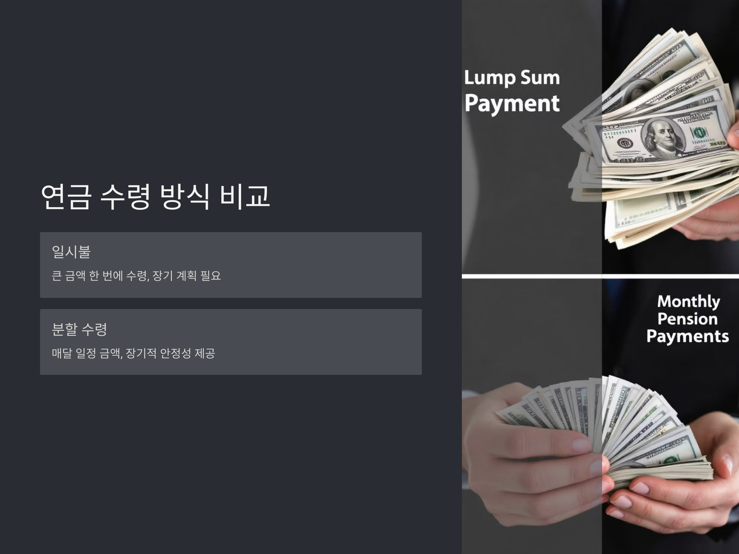 퇴직 후 연금을 일시불로 받는 것은 한 번에 큰 금액을 받을 수 있는 장점이 있지만, 장기적인 재정 계획이 부족할 수 있습니다. 반면, 분할 수령은 매달 일정한 금액을 받기 때문에 장기적인 재정적 안정성을 제공합니다. 자신의 생활 패턴과 필요한 자금에 맞는 방법을 선택하는 것이 좋습니다.