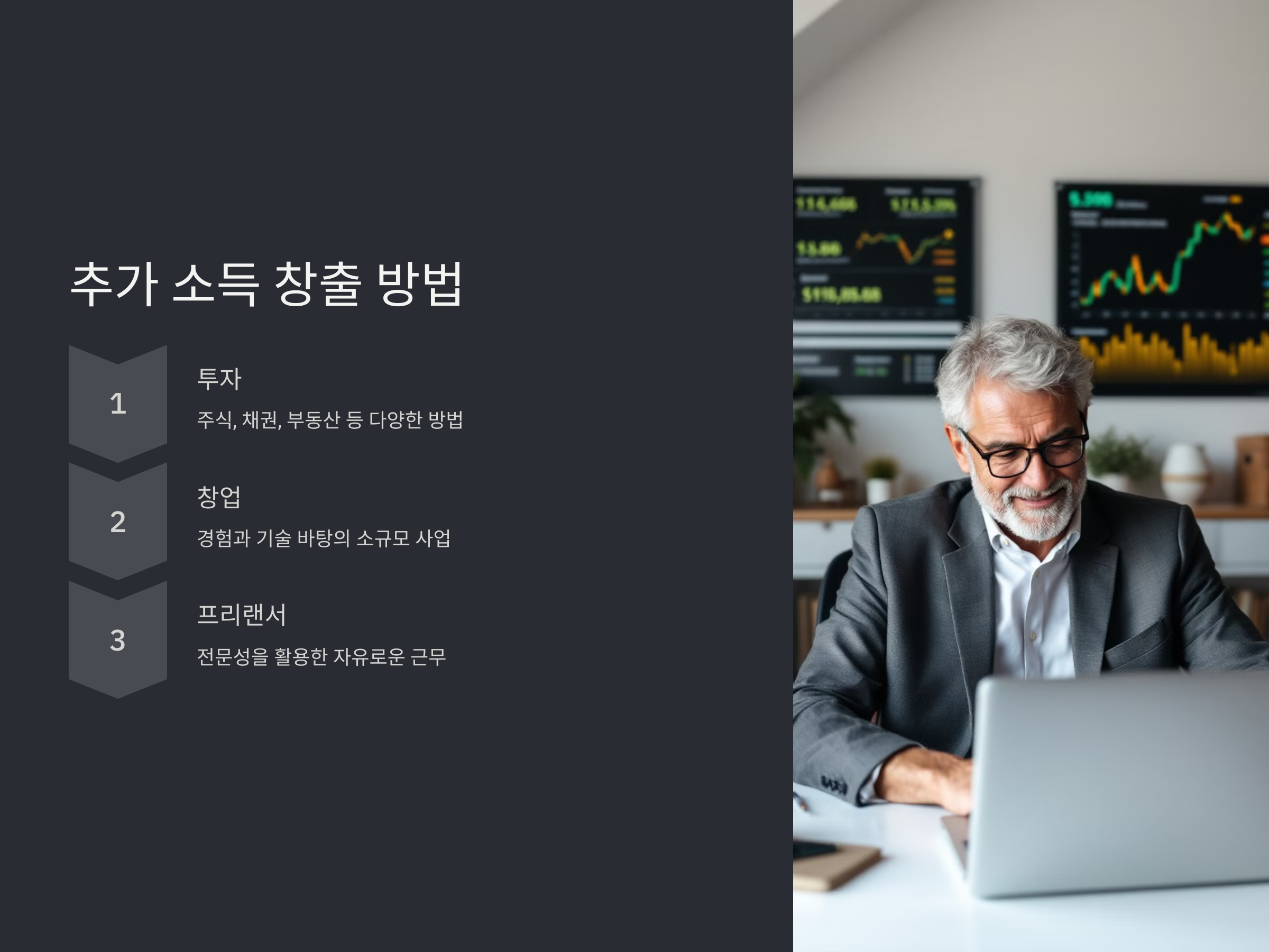 퇴직 후 추가적인 소득을 얻을 수 있는 방법으로는 주식, 채권, 부동산 투자 외에도 프리랜서로 일하거나 창업을 고려할 수 있습니다. 자신의 경험과 자산을 활용하여 다양한 수익원을 창출하는 것이 중요합니다.