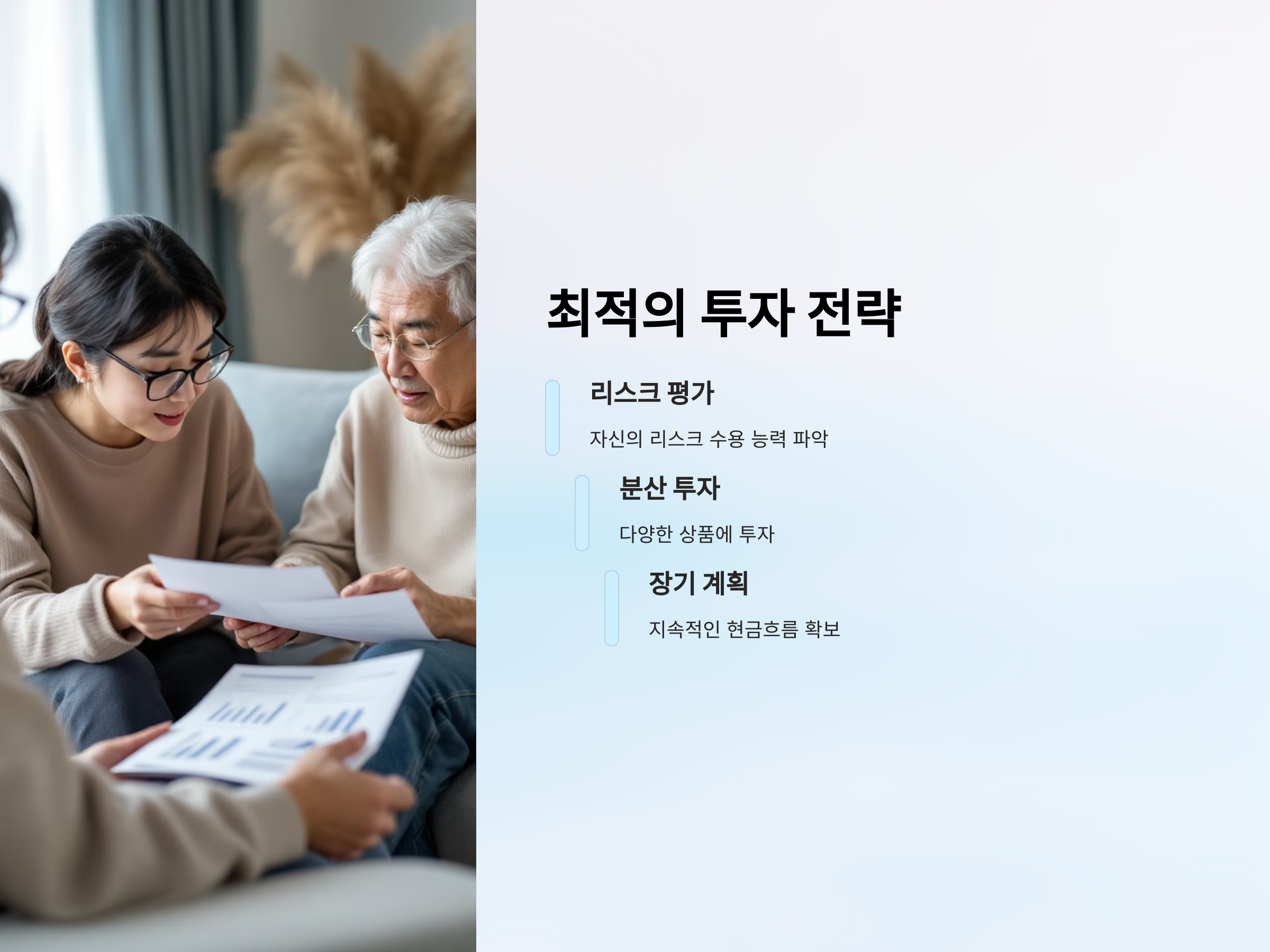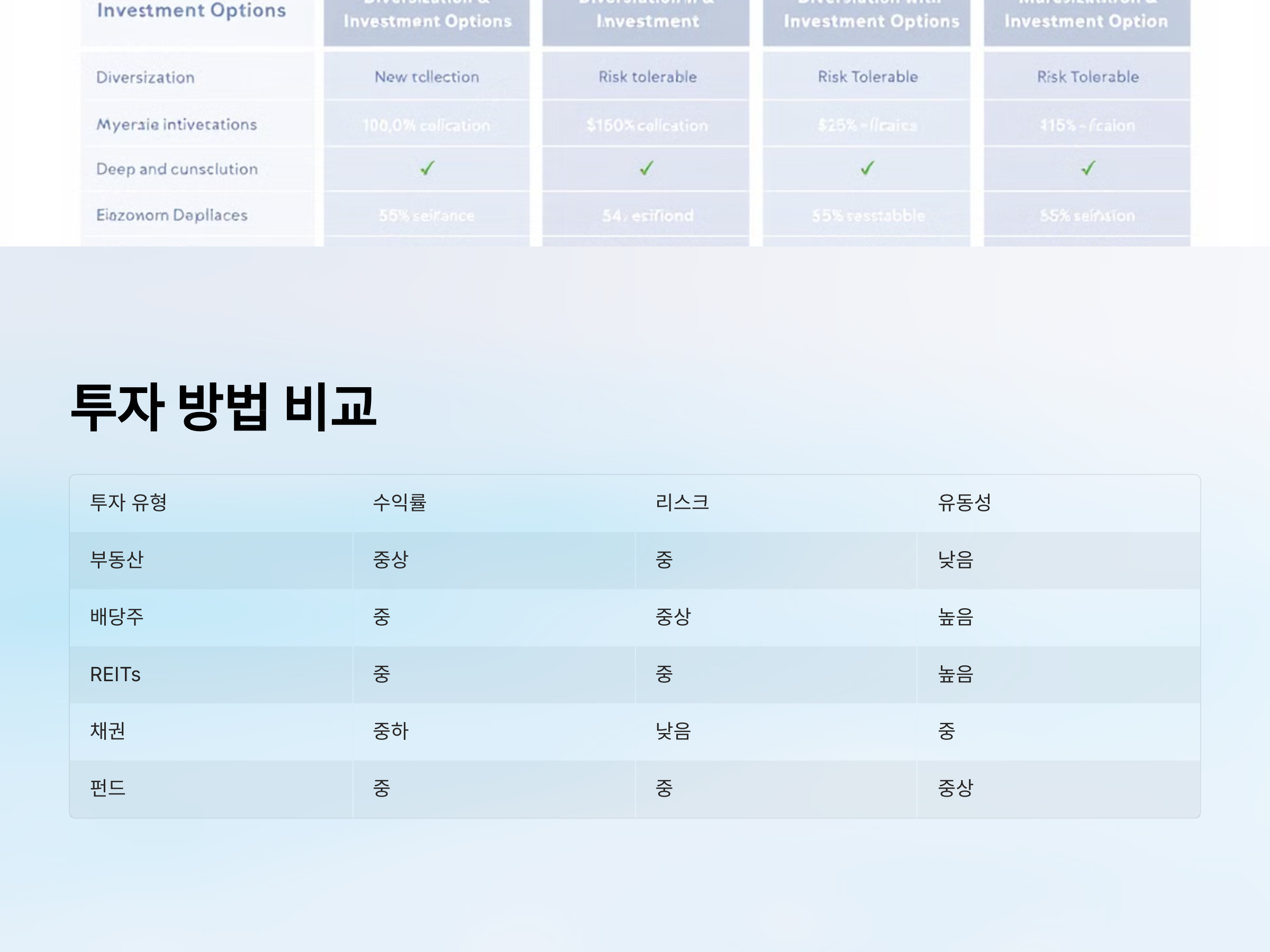 퇴직 후 수익을 안정적으로 얻기 위해서는 투자처가 제공하는 수익률뿐만 아니라, 자산의 안전성도 함께 고려해야 합니다. 또한, 자신이 원하는 리스크 수준에 맞는 상품을 선택하는 것이 매우 중요합니다. 이제 퇴직 후 월세처럼 수익을 얻을 수 있는 다양한 투자 방법을 알아보겠습니다.