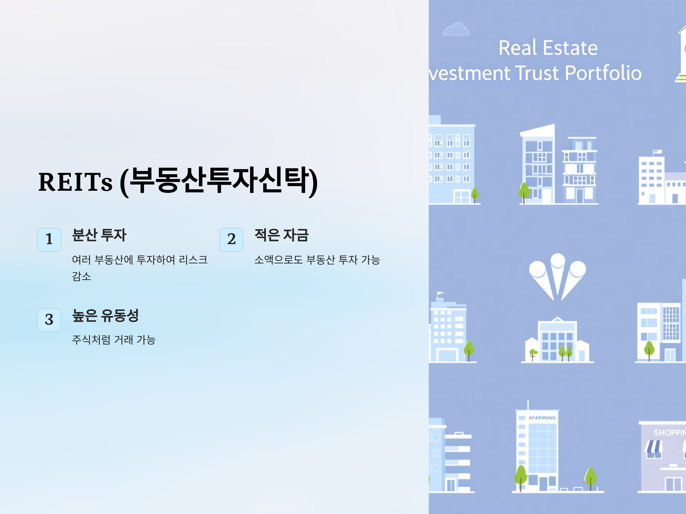 REITs는 여러 부동산 자산에 투자하는 펀드입니다. 여러 부동산에 분산 투자할 수 있어 리스크가 낮고, 일정 부분의 수익을 배당 형태로 지급받을 수 있습니다. REITs는 비교적 적은 자금으로도 부동산에 투자할 수 있는 장점이 있으며, 주식처럼 거래가 가능해 유동성이 뛰어납니다.