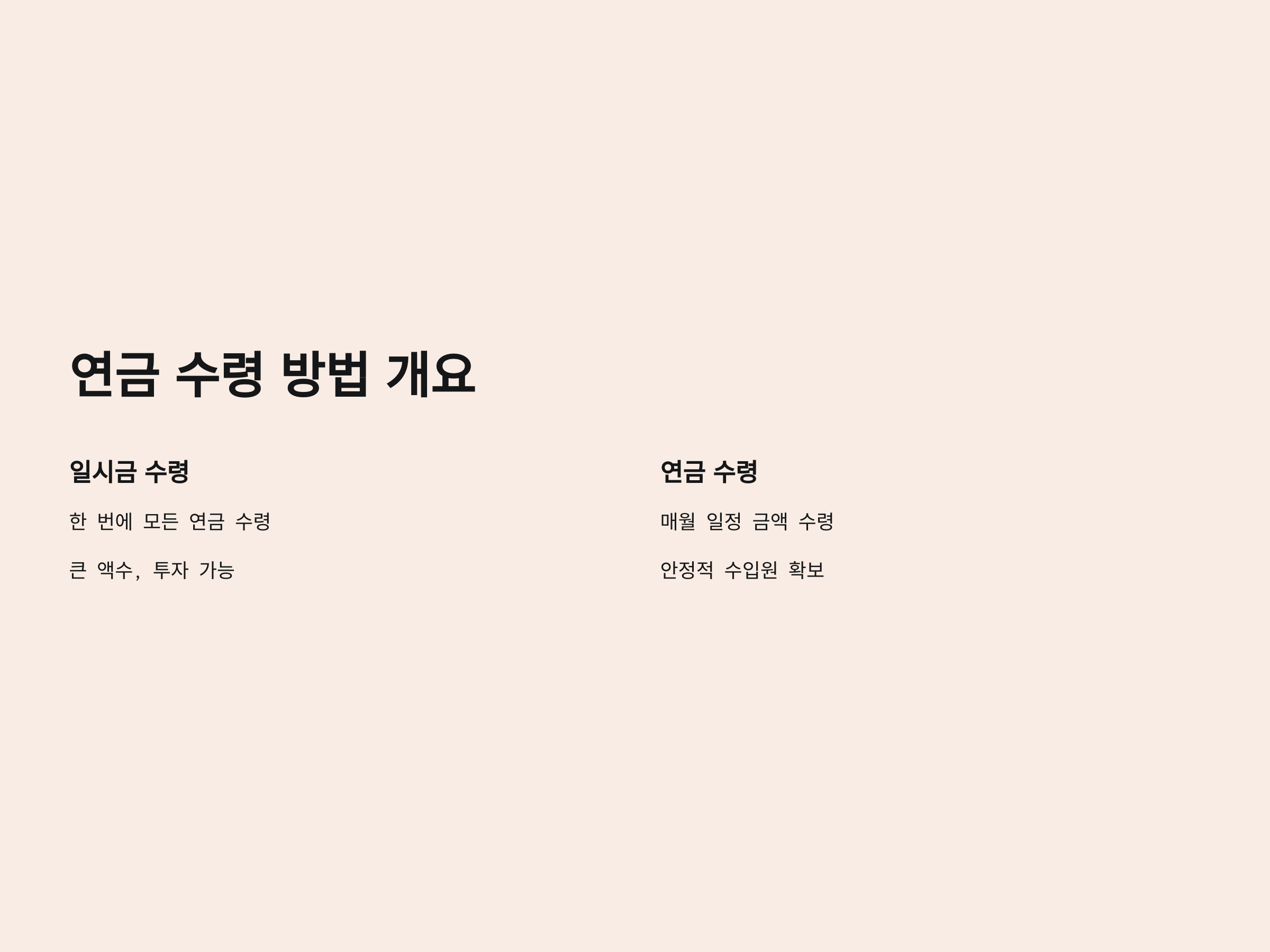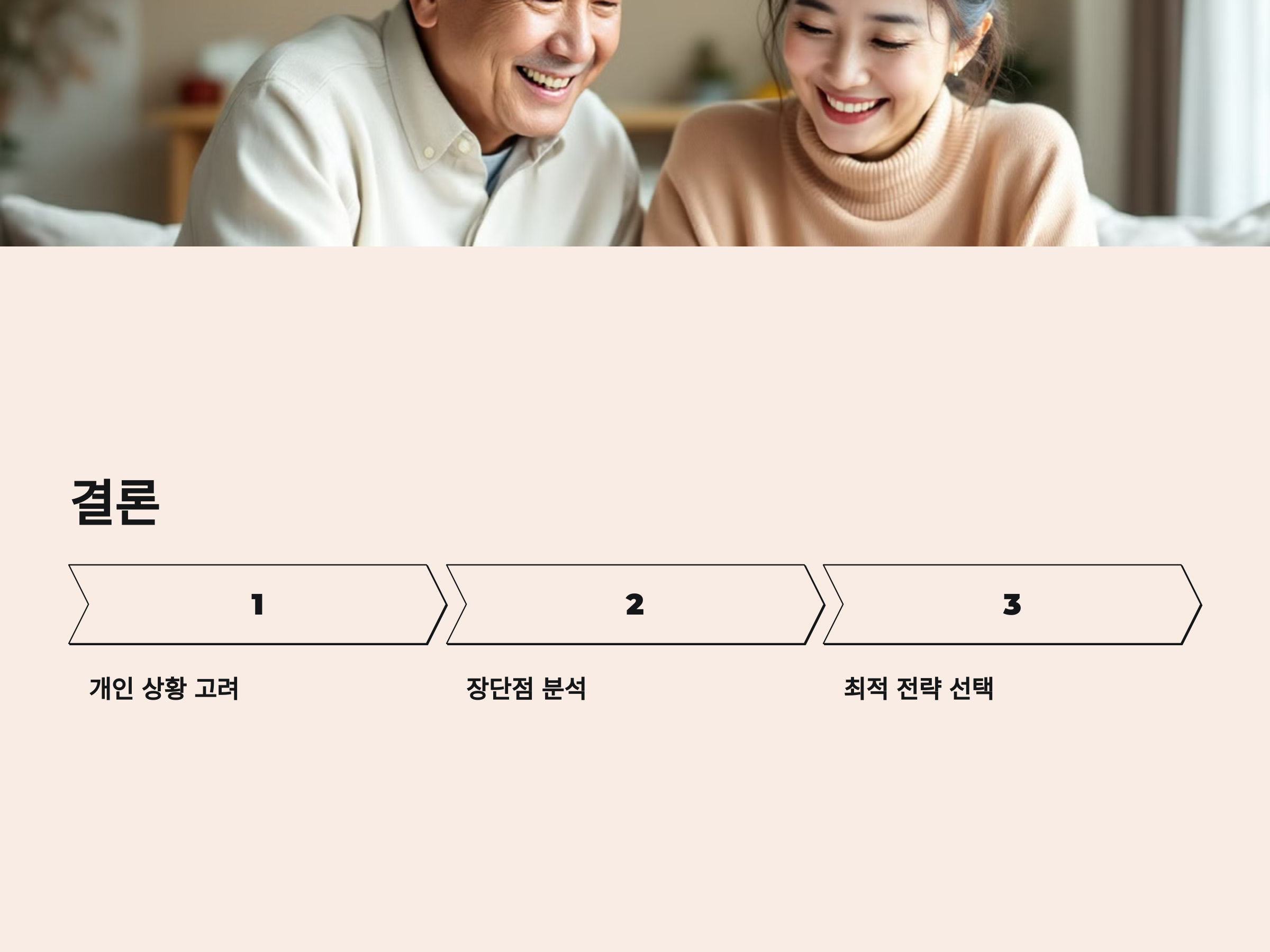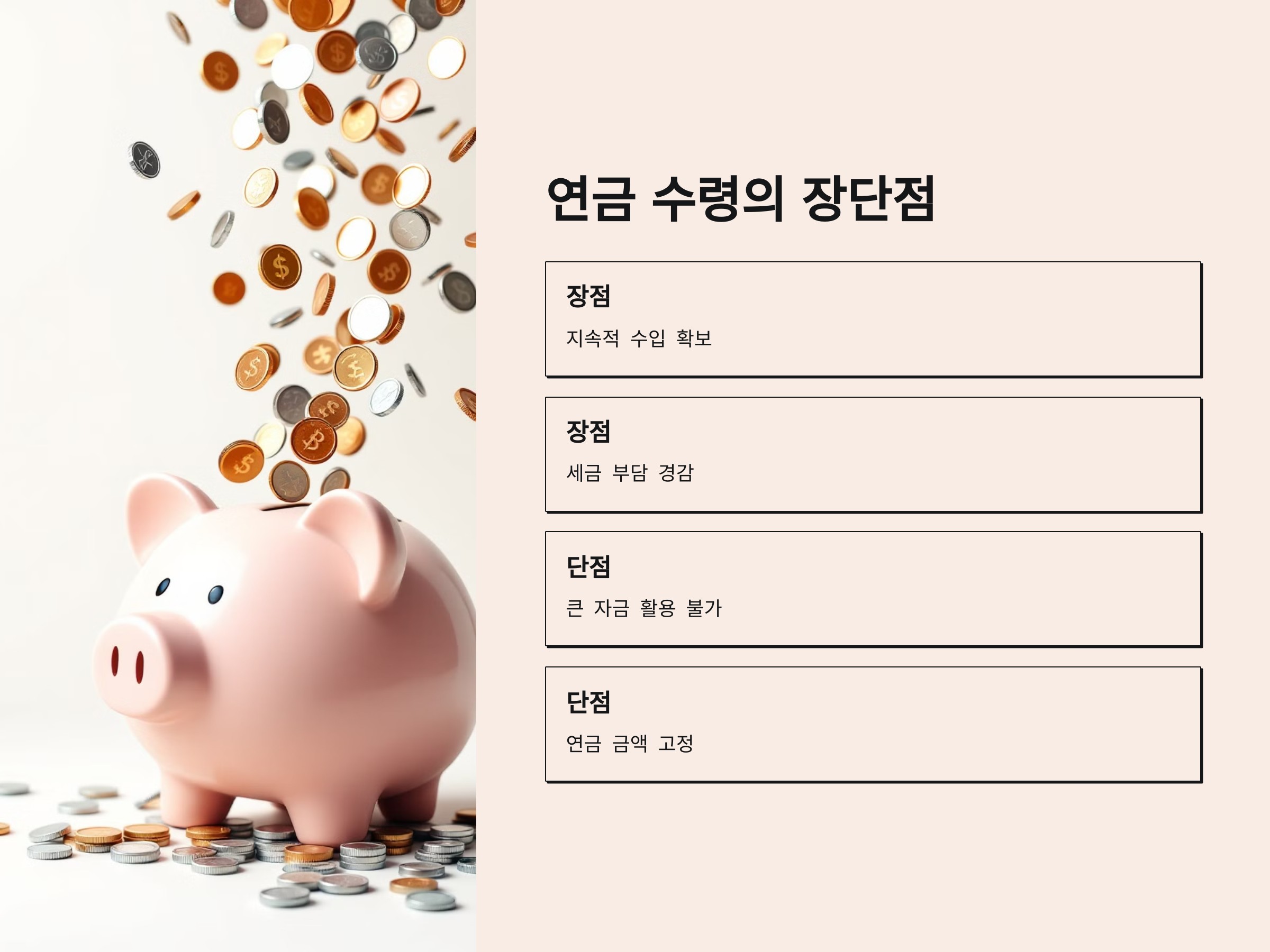 - 매월 일정 수입 부족: 일시금 수령 후 매월 일정한 금액이 들어오는 수입이 없으므로, 장기적인 안정적인 수입원이 필요하다면 불리할 수 있습니다.