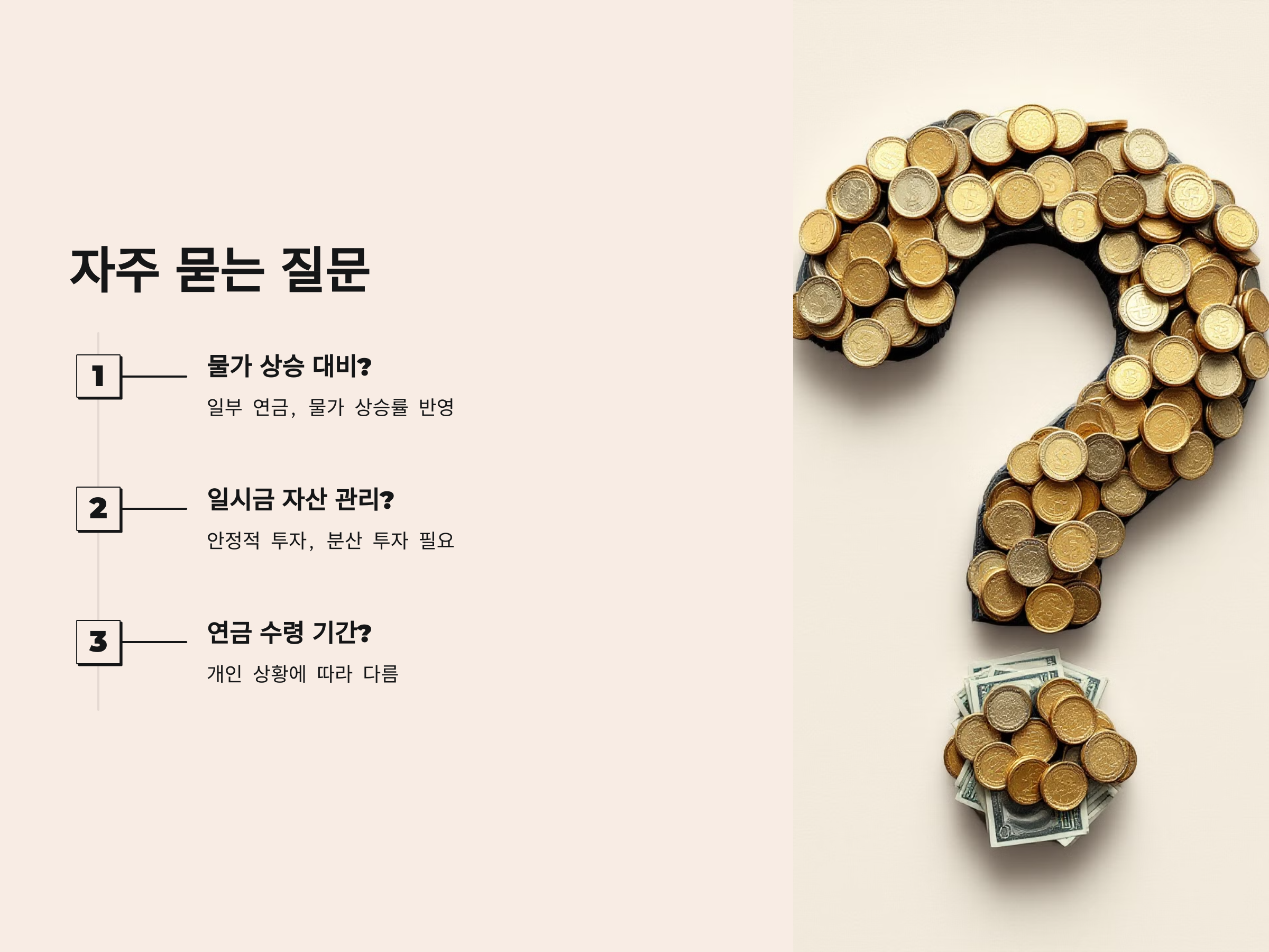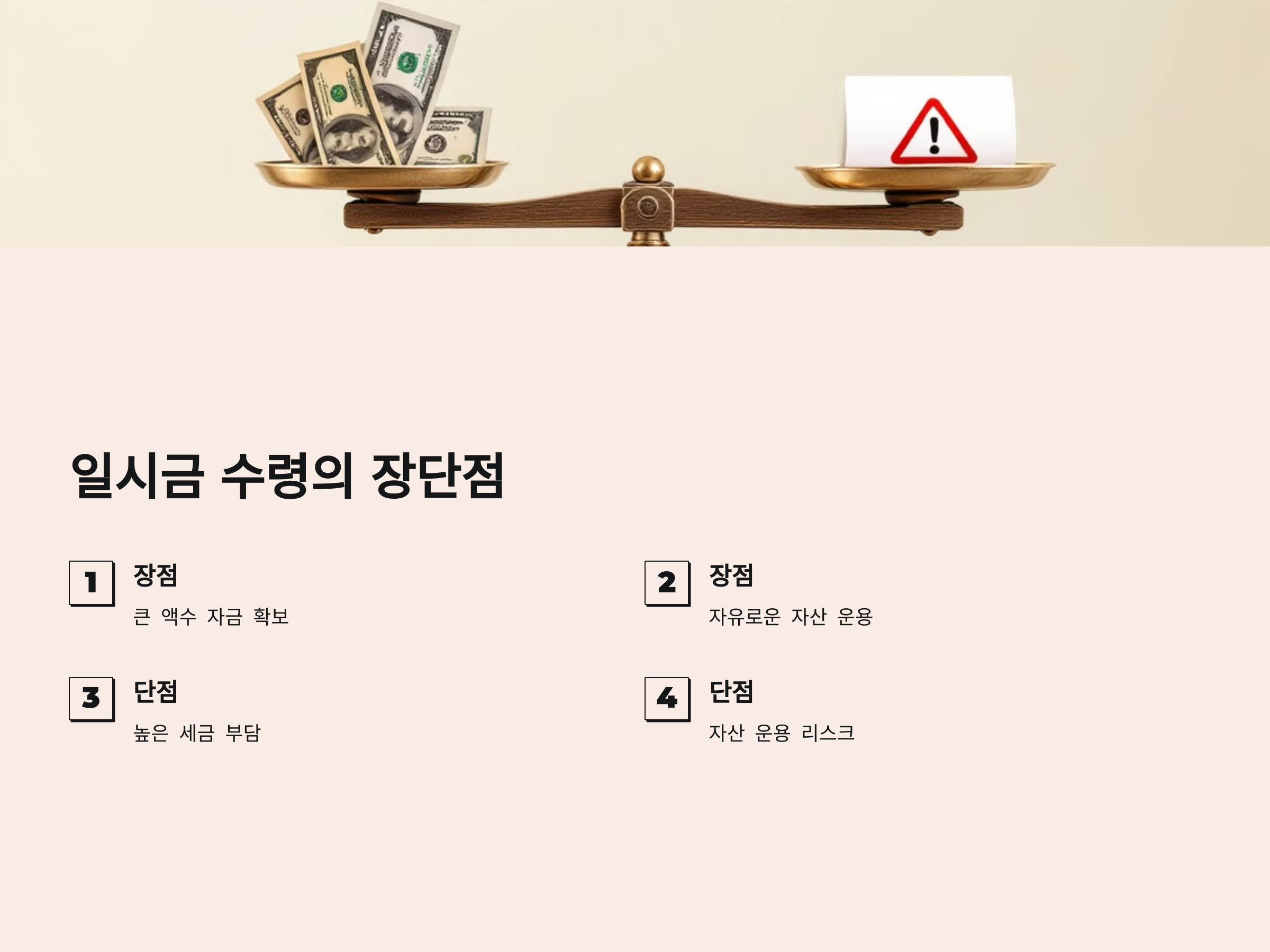 - 자산 운용 리스크: 일시금을 받은 후 자금을 잘못 운용하면, 예상보다 빠르게 자산이 고갈될 수 있습니다. 자산을 잘 관리하지 않으면 금융적인 불안정성이 생길 수 있습니다.