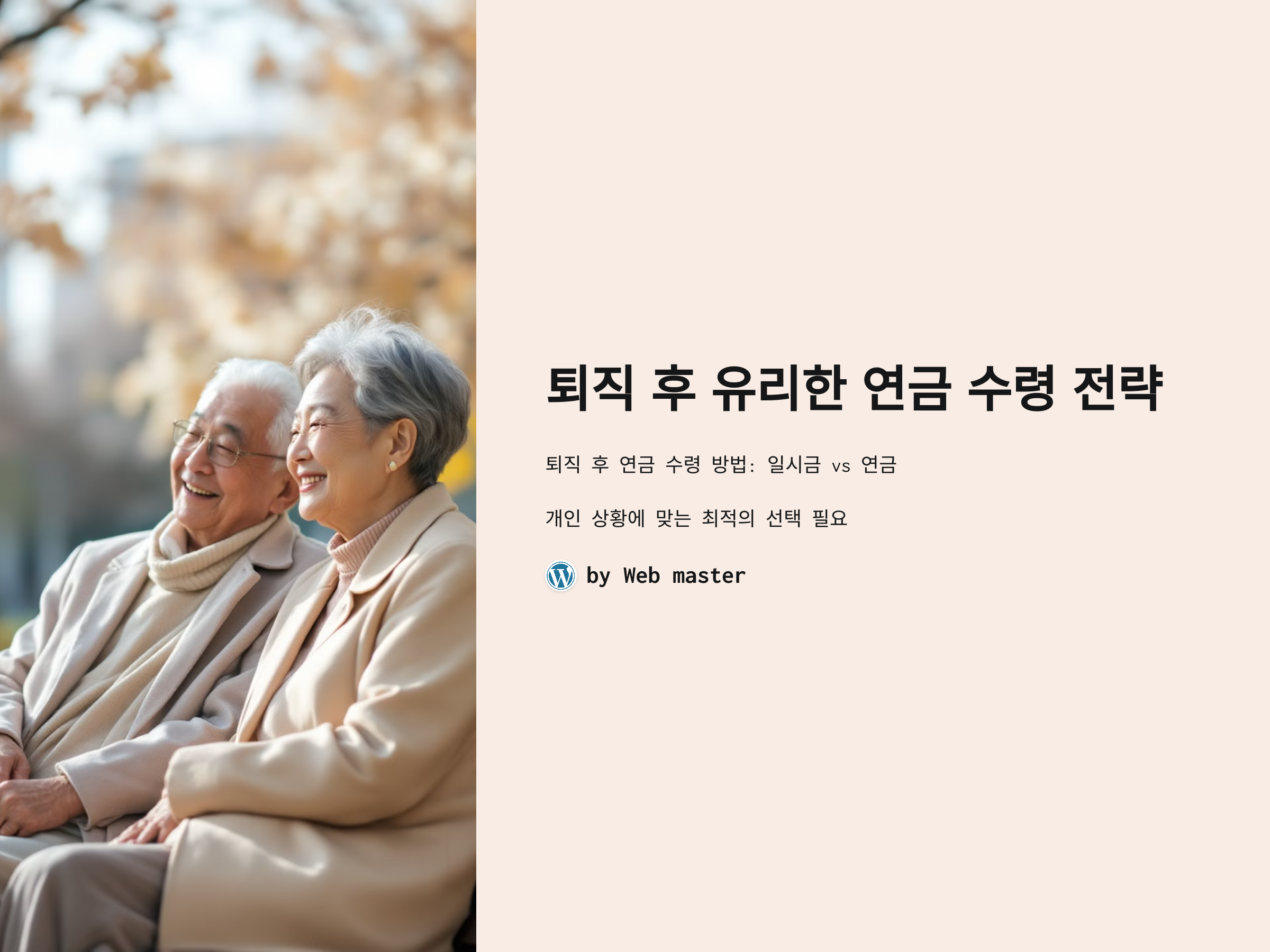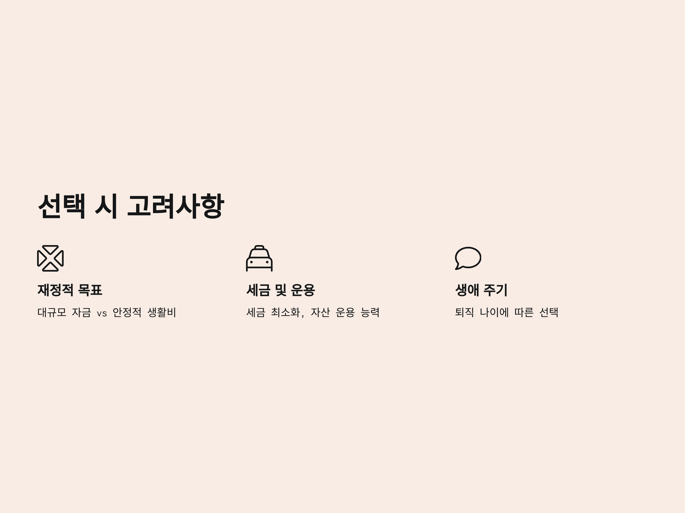 따라서, 퇴직 후 자신이 가장 중요하게 생각하는 요소—안정적인 생활비, 자산 운용의 능력, 세금 부담 등—을 고려하여 최적의 수령 방법을 선택하는 것이 중요합니다.