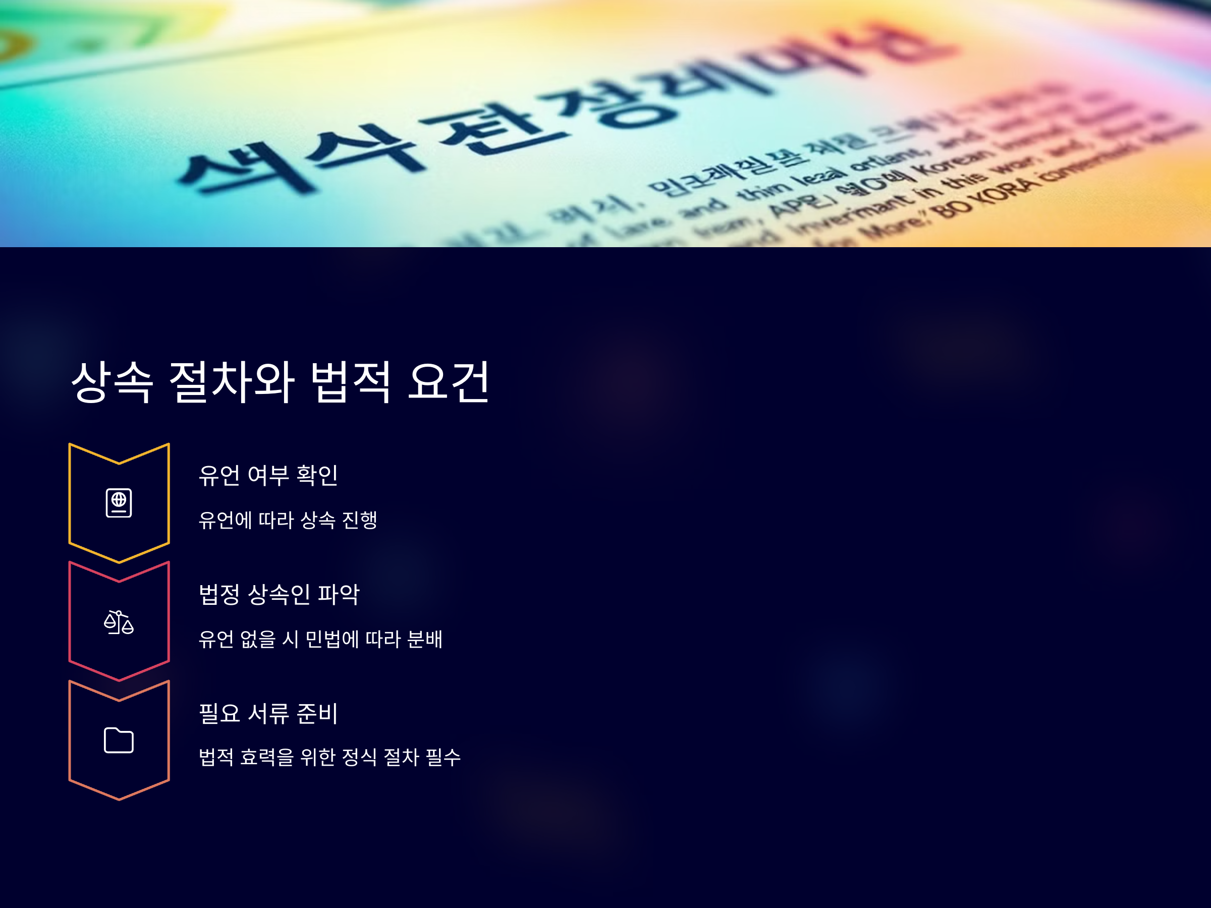 퇴직 후 상속 절차는 매우 복잡할 수 있으며, 법적으로 반드시 지켜야 할 규정들이 있습니다. 상속이 이루어지기 전에 상속인의 자격과 상속 가능한 재산의 종류를 정확히 이해해야 합니다. 상속인이 누구인지, 상속 가능한 재산이 무엇인지, 그리고 법적으로 필요한 서류들이 무엇인지를 파악하는 것이 중요합니다.