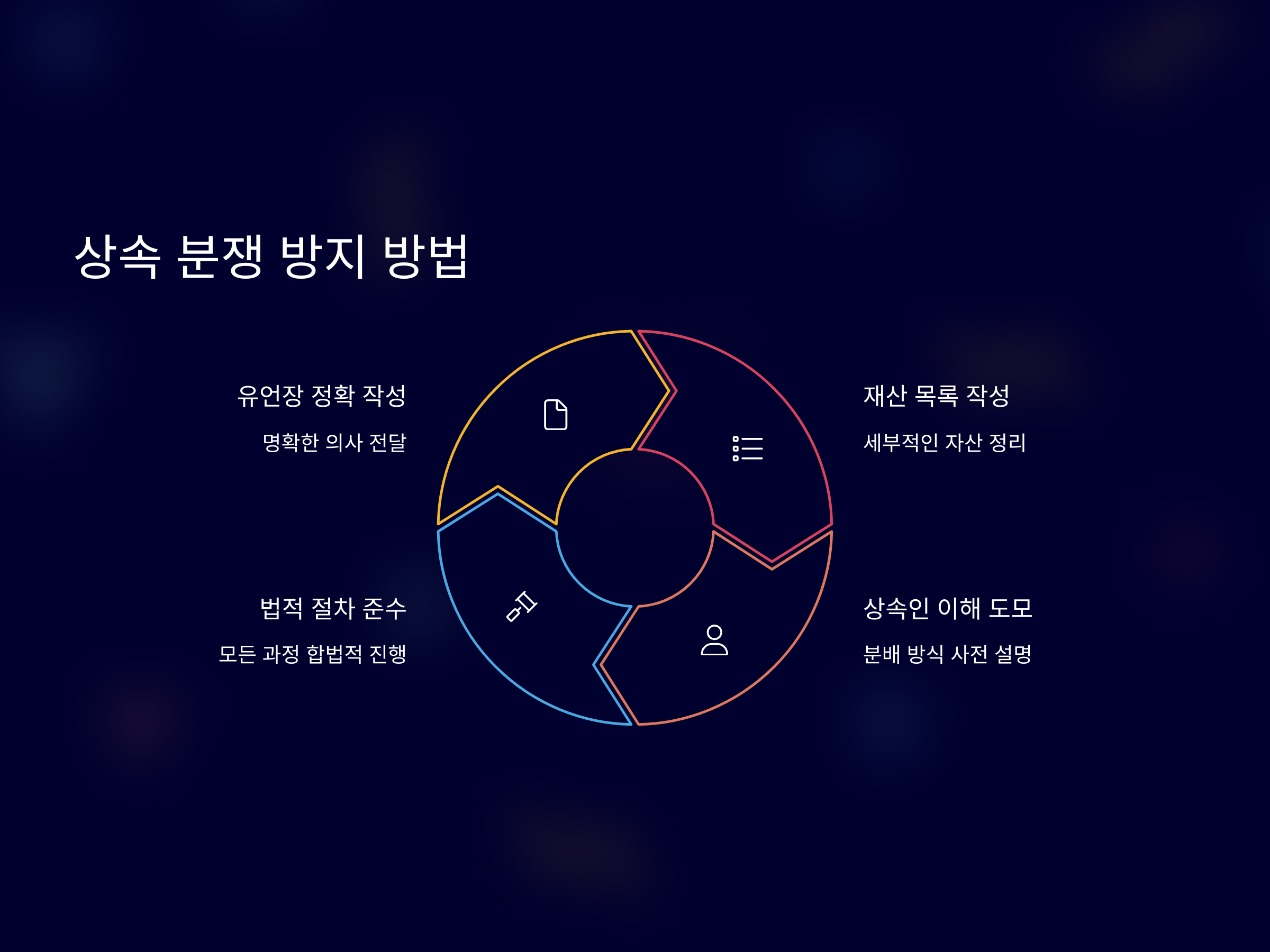 퇴직 후 유산 상속 시 가장 많이 발생하는 문제 중 하나는 상속 분쟁입니다. 상속인의 수가 많거나, 유언장이 없을 경우 상속인들 간의 갈등이 발생할 수 있습니다. 이러한 갈등을 예방하려면 유언장을 정확하게 작성하고, 상속인의 의사를 미리 전달하는 것이 중요합니다.
