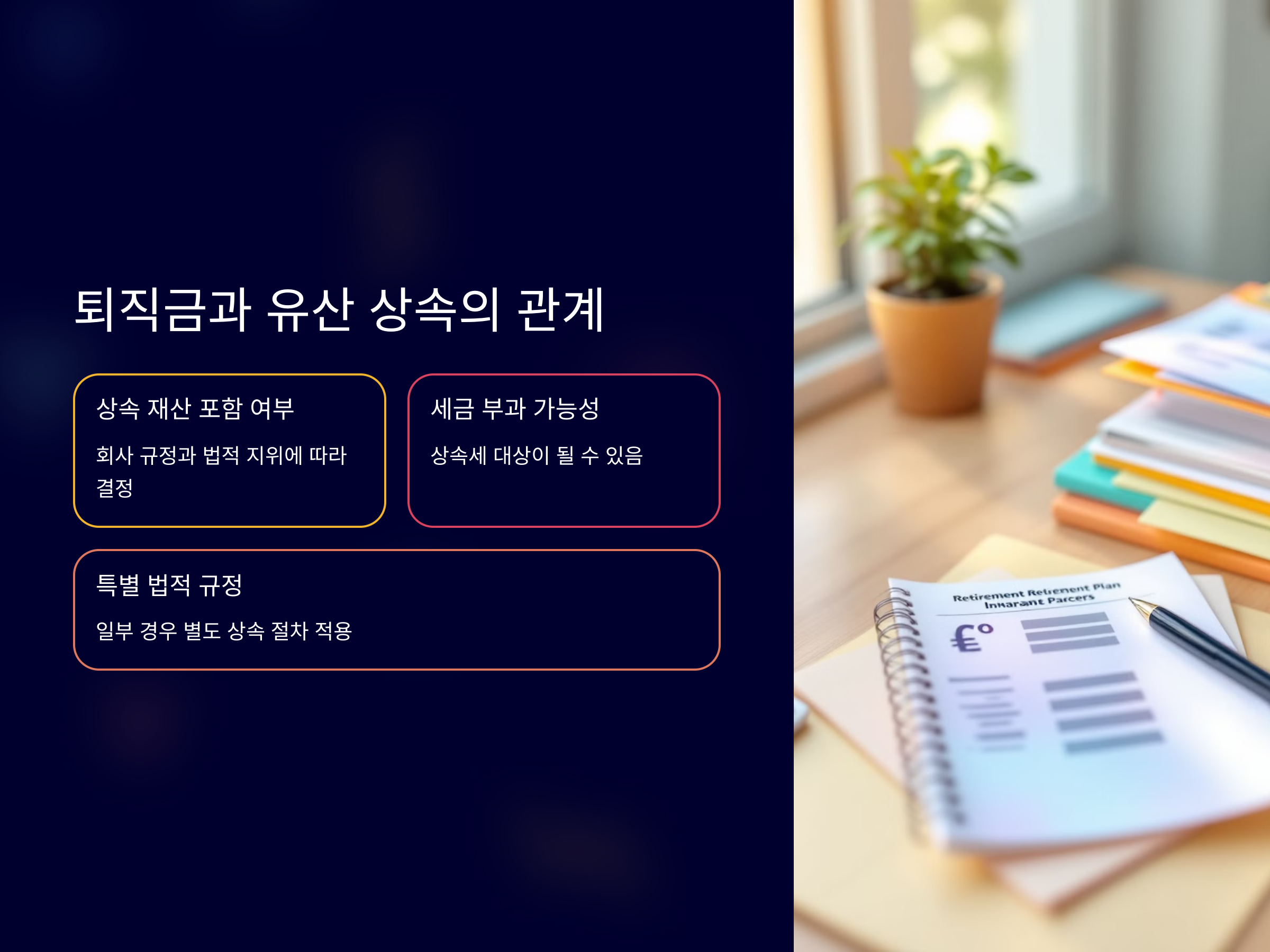 퇴직금이 상속 재산에 포함될지 여부는 회사의 규정과 상속인의 법적 지위에 따라 달라질 수 있습니다. 퇴직금이 상속 재산에 포함될 경우, 상속세가 부과될 수 있기 때문에 이를 사전에 고려하고 준비하는 것이 중요합니다. 퇴직금은 상속 재산의 일부로 간주되지만, 때로는 특정한 법적 규정에 따라 상속이 이루어지기도 합니다.