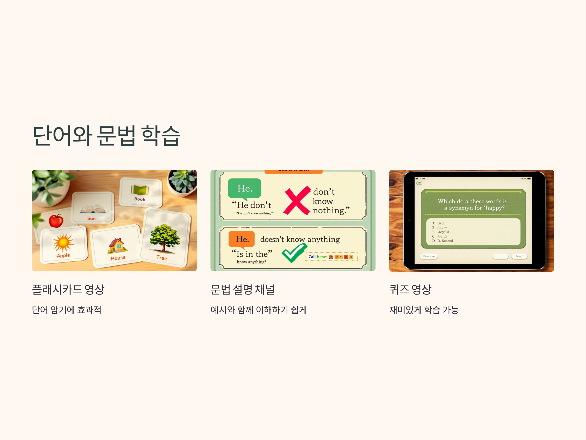 영어 단어와 문법을 학습할 때, 유튜브를 통해 재미있게 배우는 방법도 많습니다. 예를 들어, 단어를 학습할 때 유튜브에서 제공하는 플래시카드 형식의 영상이나, 단어를 주제로 한 퀴즈 영상 등을 활용하면 더 효과적으로 암기할 수 있습니다.