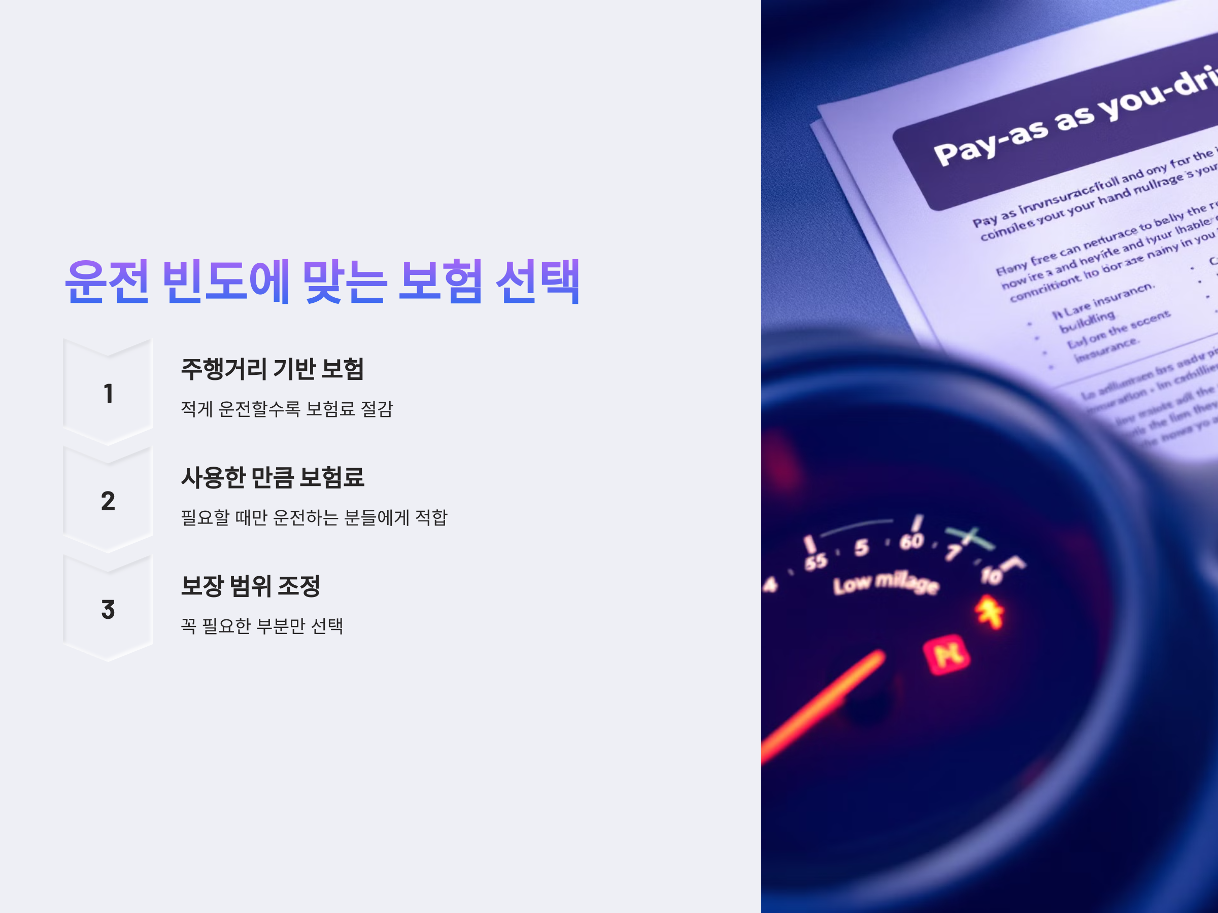 운전 빈도에 맞는 상품을 선택하는 것 외에도, 자동차 보험의 보장 범위를 조정할 수 있습니다. 예를 들어, 보험의 보장 범위를 좁히고, 꼭 필요한 부분만 선택하는 것도 비용 절감에 효과적입니다. 보장 범위를 줄이는 대신, 사고 발생 시 본인이 부담해야 하는 금액이 늘어나기 때문에, 본인의 운전 스타일과 사고 발생 가능성에 따라 신중하게 선택해야 합니다.