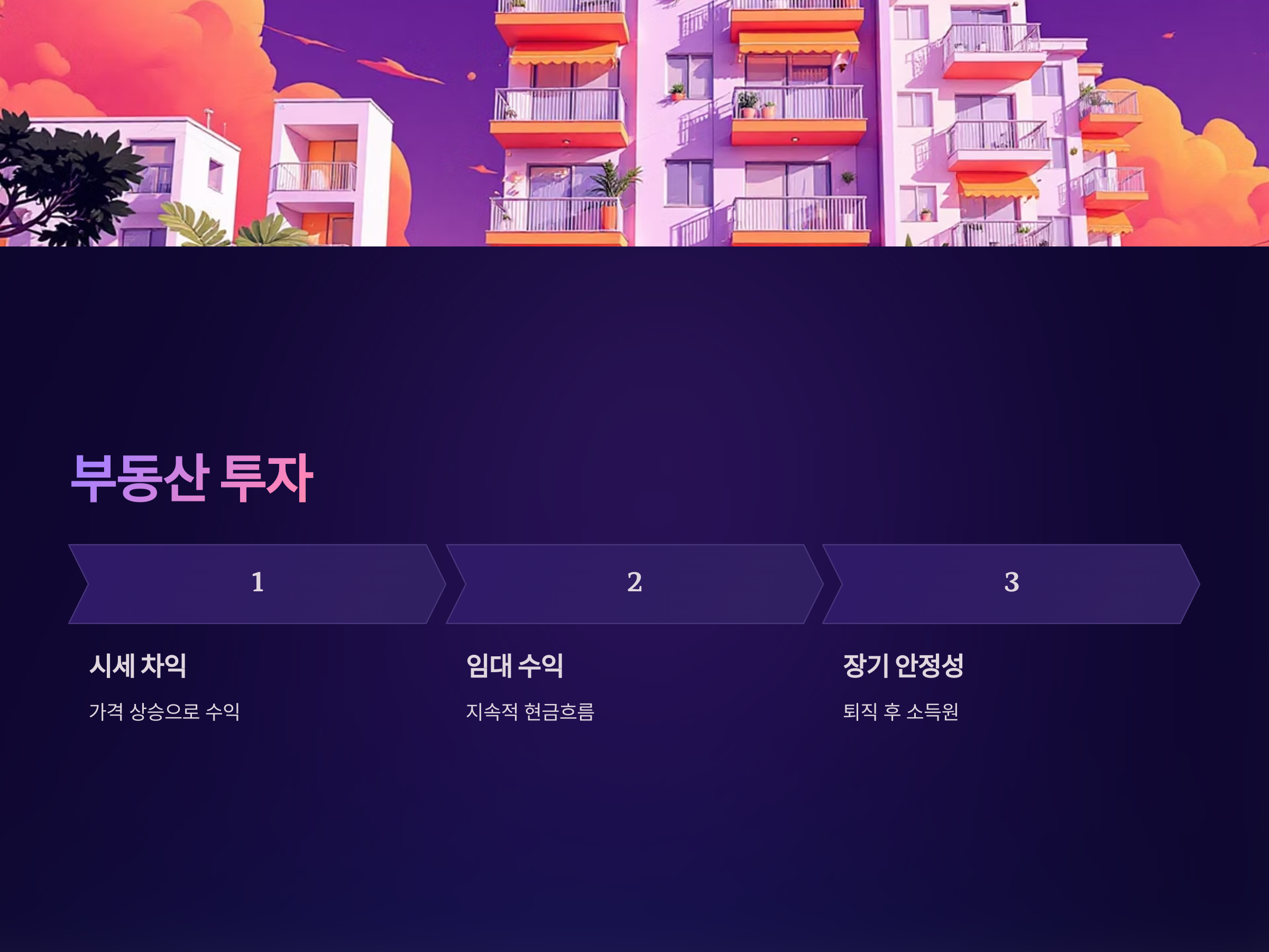 부동산은 고위험 투자의 대안으로 안정적인 수익을 얻을 수 있는 대표적인 방법입니다. 특히 퇴직 후에는 소극적인 투자 방법을 찾는 경향이 강한데, 이때 부동산 투자에 대한 관심이 높습니다. 부동산은 기본적으로 가격 상승에 따른 시세 차익 외에도 임대수익을 통해 지속적인 현금 흐름을 얻을 수 있는 장점이 있습니다.