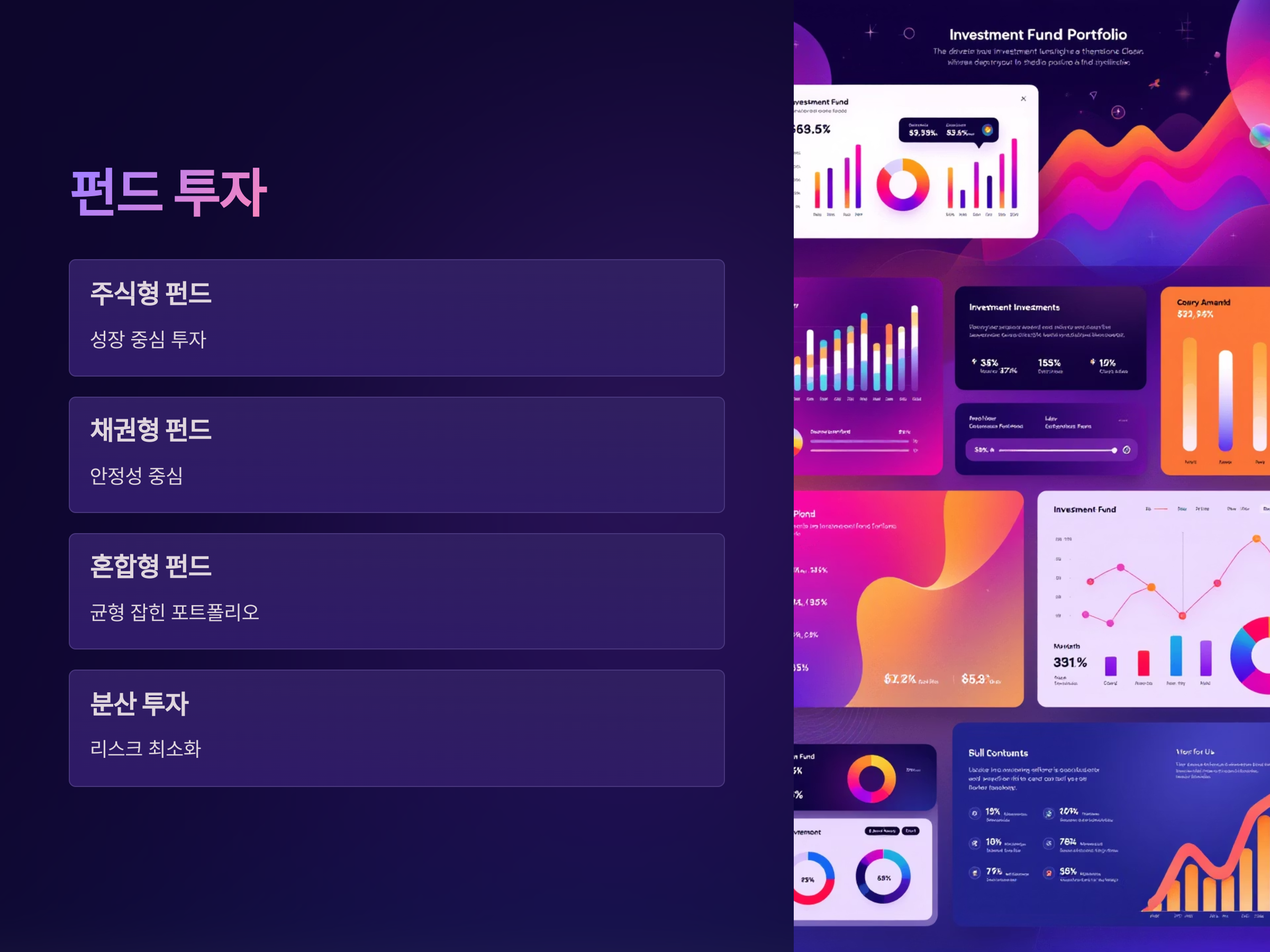 펀드 투자는 자산을 여러 가지 종류로 분산하여 리스크를 줄이면서도 수익을 추구할 수 있는 방법입니다. 특히 퇴직 후에는 한 가지 자산에 집중하기보다 분산 투자하는 것이 중요합니다. 다양한 펀드 상품을 통해 안정적인 수익을 얻을 수 있습니다.