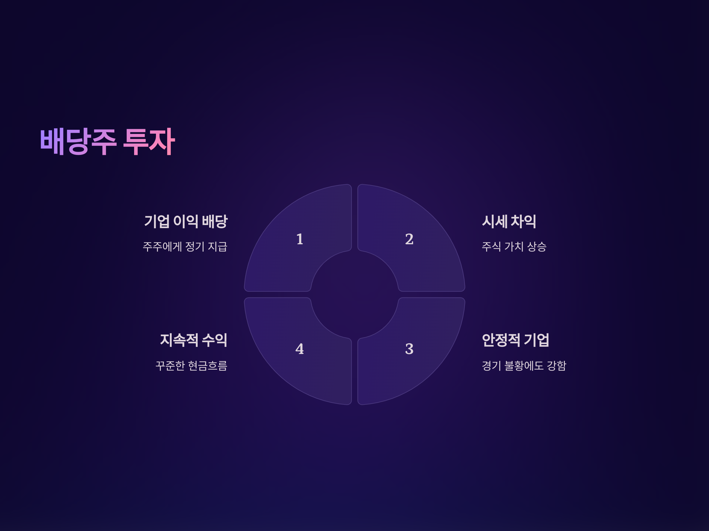 배당주는 상대적으로 리스크가 적고, 지속적으로 배당금을 지급하는 기업들은 경기 불황에도 비교적 안정적인 수익을 제공합니다. 배당주 투자에서는 꾸준히 배당금을 지급하는 기업을 선택하는 것이 중요하며, 주식 시장의 변동성이 있지만, 안정적인 수익을 원할 때 매우 효과적인 방법입니다.