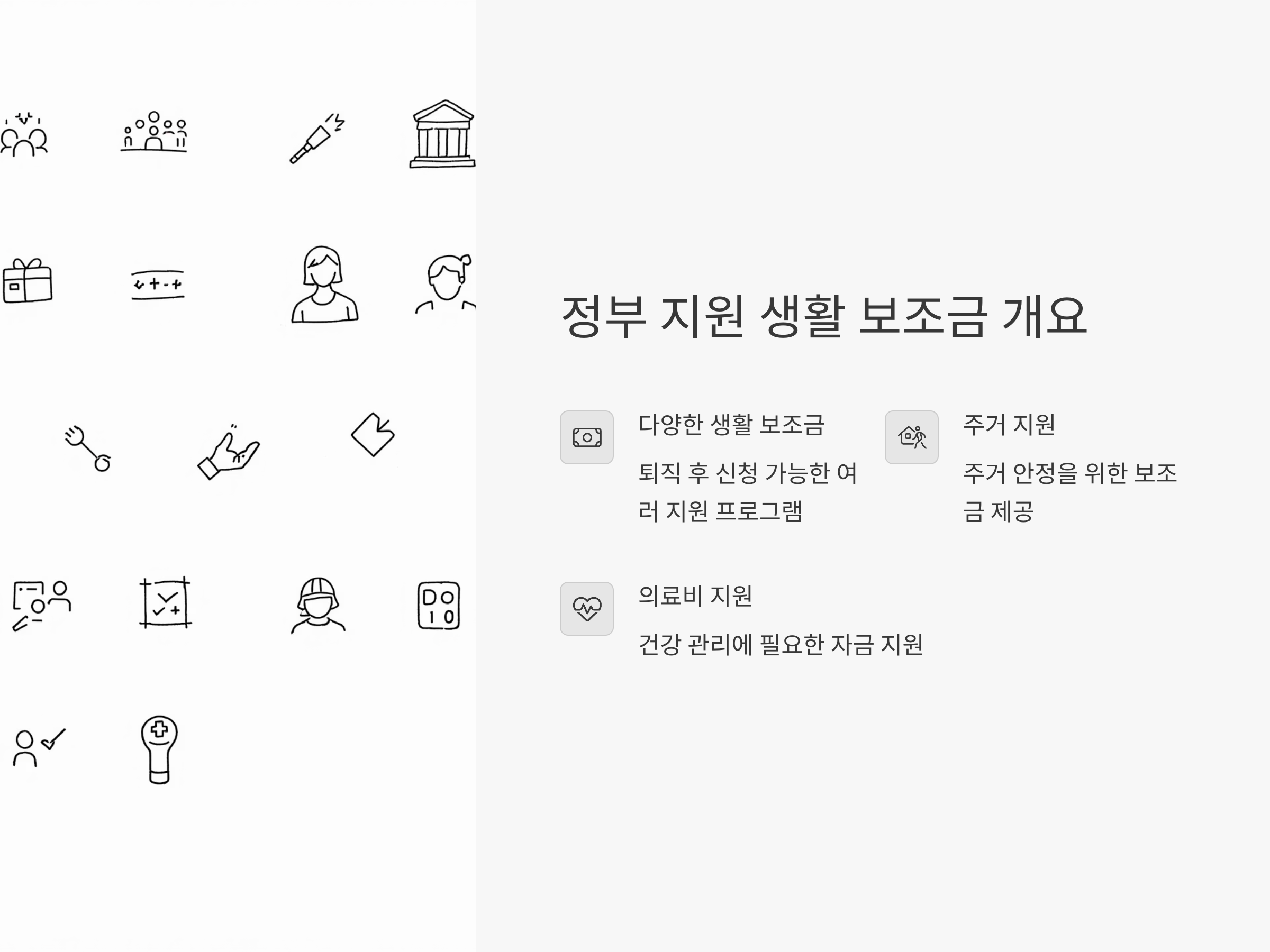 퇴직 후에는 경제적인 어려움을 겪을 수 있기 때문에 정부에서 제공하는 다양한 생활 보조금 프로그램을 잘 알고 활용하는 것이 중요합니다. 퇴직 후의 삶은 새로운 시작이지만, 경제적 안정을 위해 정부의 여러 지원책을 적극적으로 확인하고 이용해야 합니다. 이 글에서는 퇴직 후 지원 받을 수 있는 주요 생활 보조금과 그 혜택, 신청 방법에 대해 상세히 소개하겠습니다. 이를 통해 퇴직 후 경제적 부담을 덜고 더 나은 삶을 살 수 있는 방법을 알아보세요.