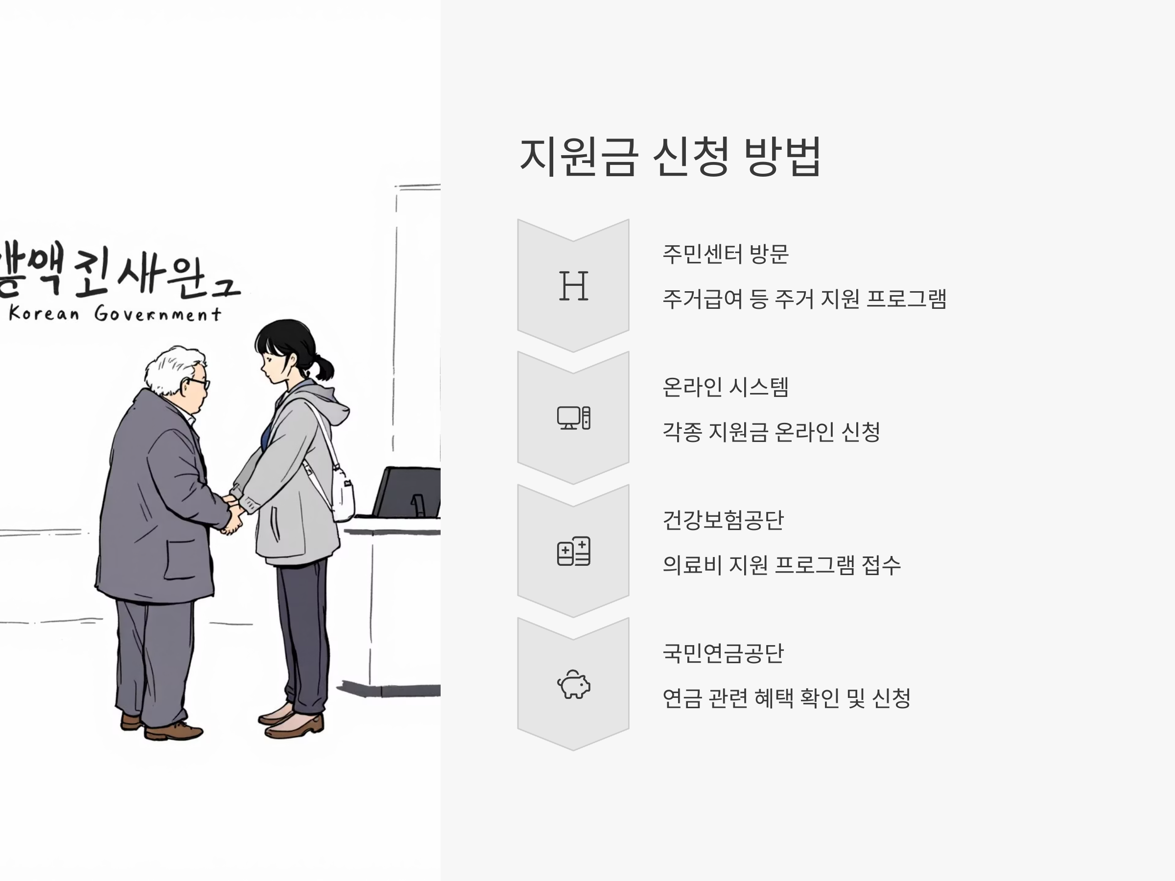 퇴직 후 정부에서 제공하는 지원금 신청 방법은 각 프로그램마다 다릅니다. 일반적으로 각 지원금은 주민센터나 온라인 시스템을 통해 신청할 수 있습니다. 주거급여와 같은 주거 지원 프로그램은 시군구청에서 신청할 수 있으며, 의료비 지원 프로그램은 건강보험공단을 통해 접수할 수 있습니다.