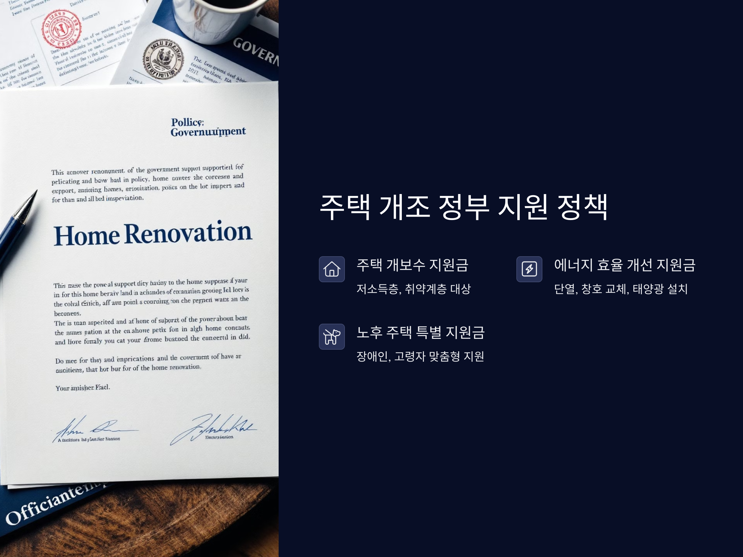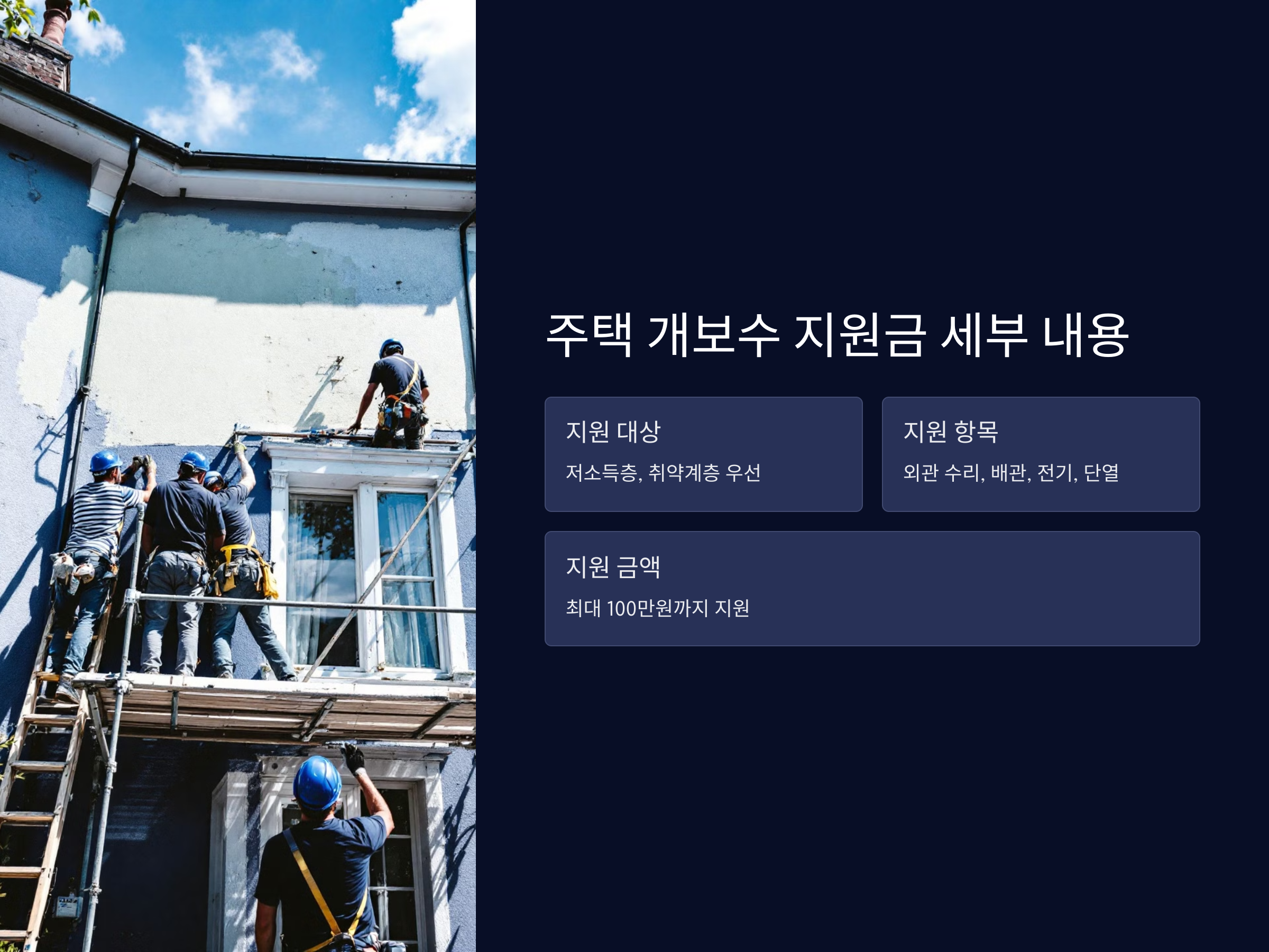 주택 개보수 지원금은 주택의 구조적 안전성을 높이거나 노후화된 부분을 개선하는 데 도움을 주는 지원금입니다. 특히, 저소득층과 취약계층을 대상으로 한 지원이 많으며, 주택 개조의 비용 일부를 보조해 주는 형태로 운영됩니다. 이러한 지원금은 주택의 외관 수리, 배관 및 전기시설 교체, 단열 보강 등의 항목에 사용할 수 있습니다. 예를 들어, 국토교통부의 ‘주택 개보수 지원 사업’에서는 저소득층 가구가 주택을 개보수할 경우 최대 100만원까지 지원하는 프로그램을 운영하고 있습니다.