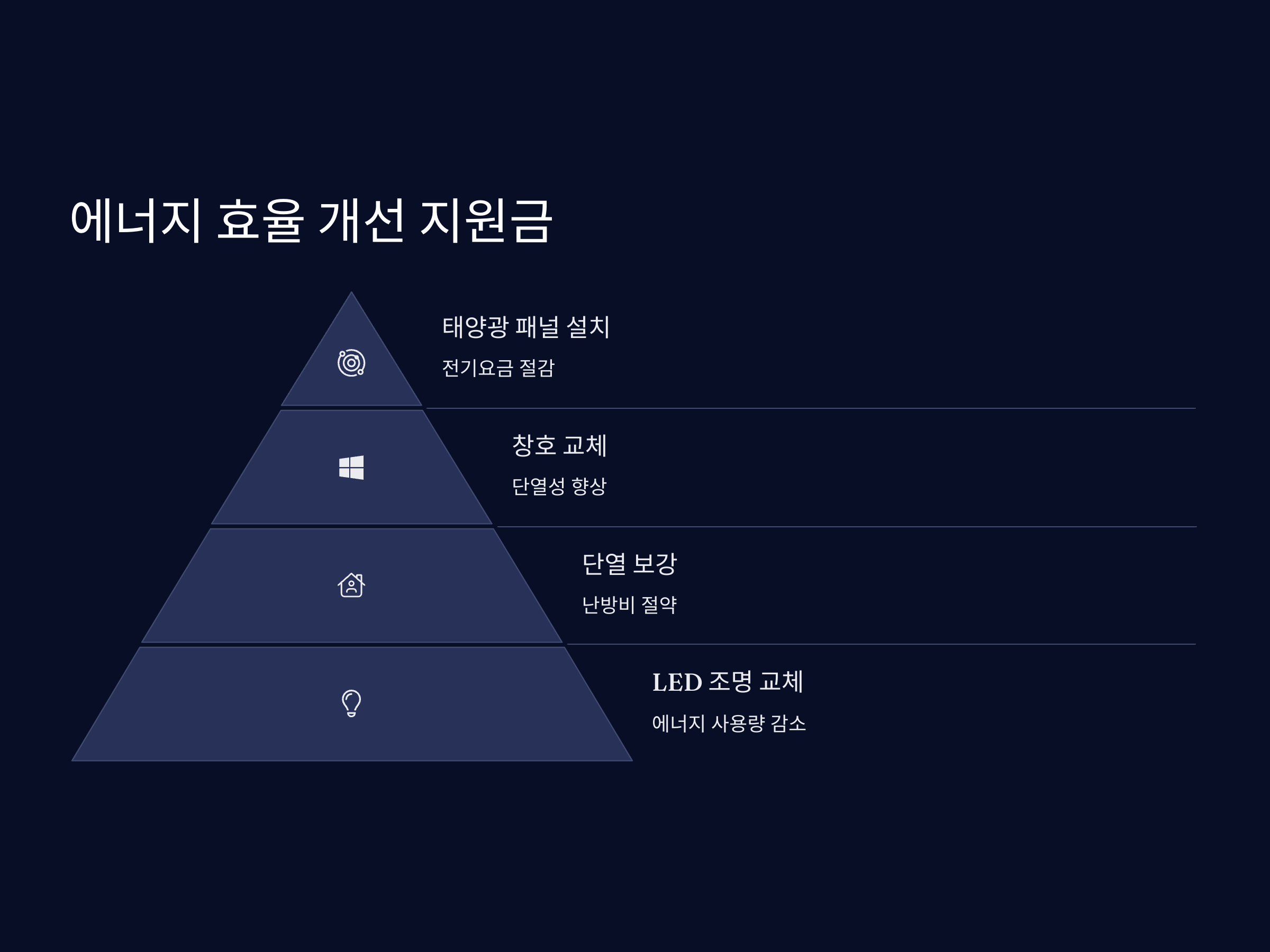 에너지 효율 개선 지원금은 주택의 에너지 사용을 절감하기 위한 개조 작업에 지원하는 금액입니다. 이 지원금은 특히 퇴직 후 생활을 더 경제적으로 관리하고자 하는 분들에게 유용할 수 있습니다. 주택의 단열과 창호 교체 작업, 태양광 패널 설치, LED 조명 교체 등의 작업을 통해 에너지 효율을 높이면 정부에서 지원금을 받을 수 있습니다. 한국에너지공단은 이러한 사업을 지원하며, 신청자는 자신의 집이 에너지 효율 등급을 개선하는 작업을 하는 경우 지원금을 받을 수 있습니다.