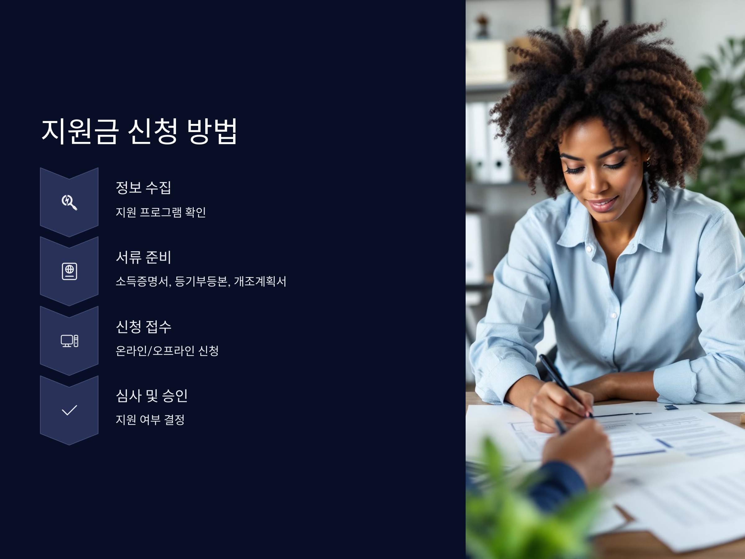 정부에서 제공하는 주택 개조 지원금은 각 지방자치단체와 연계하여 신청할 수 있습니다. 신청 방법은 보통 온라인 신청이나 오프라인 신청을 통해 가능하며, 일부 프로그램은 기초생활수급자나 저소득층을 대상으로 한 우선 신청이 가능할 수 있습니다. 또한, 에너지 효율 개선 사업은 온라인으로 신청하는 경우가 많아, 관련 사이트에서 신청서를 작성하고 필요한 서류를 제출하면 됩니다.