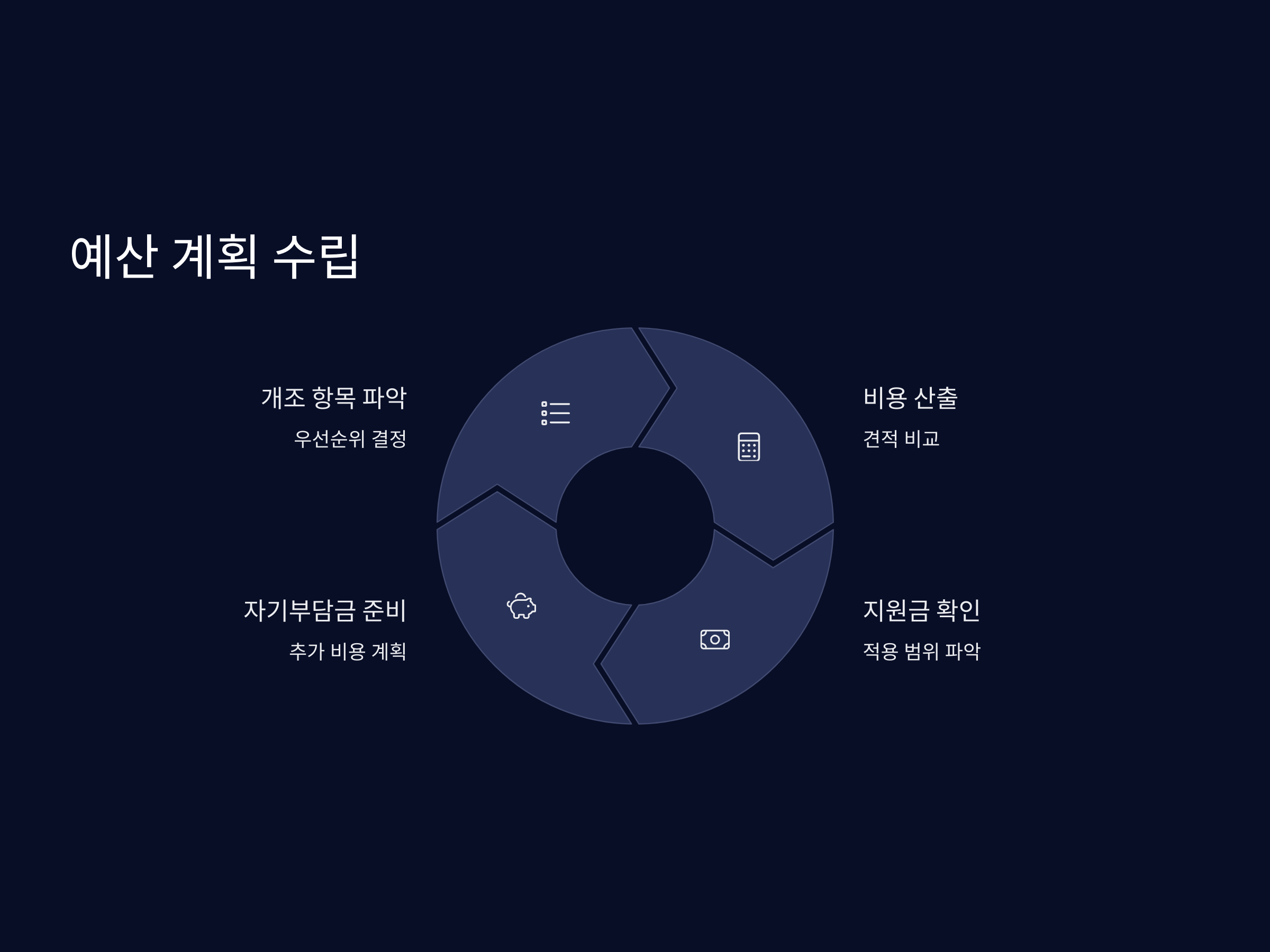 주택 개조를 위한 예산을 수립할 때는 먼저 개조가 필요한 부분을 정확하게 파악해야 합니다. 주택의 노후도, 수리해야 할 부분 등을 점검하여 우선순위를 정하고, 그에 맞는 예산을 책정합니다. 정부 지원금은 한정되어 있기 때문에, 지원금이 전액을 커버하지 못하는 경우가 많습니다. 따라서 추가 비용을 고려한 예산을 세우는 것이 중요합니다.