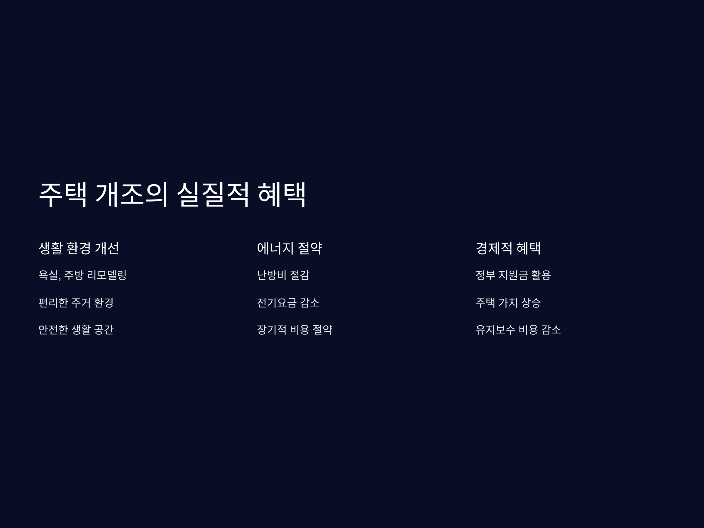 에너지 효율 개선 작업은 장기적으로 보면 상당한 비용 절감을 가져올 수 있습니다. 단열 및 창호 교체를 통해 난방비를 절감할 수 있으며, 태양광 패널 설치로 전기 요금을 줄일 수 있습니다. 퇴직 후 고정된 수입에 맞춰 생활하는데, 이러한 비용 절감은 중요한 역할을 합니다.